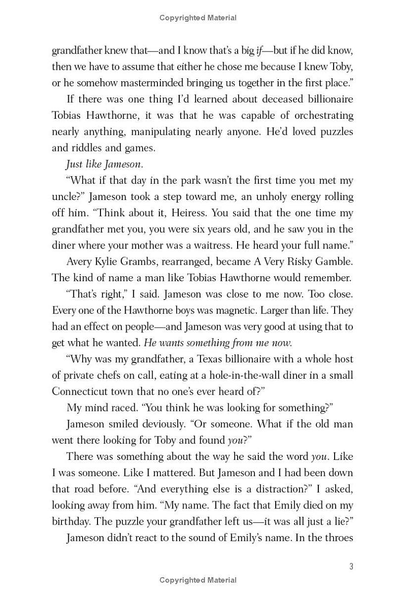 Thanks to a DNA test, Avery knows she’s not a Hawthorne by blood, but clues pile up hinting at a deeper connection to the family than she had ever imagined. As the mystery grows and the plot thickens, Grayson and Jameson, two of the enigmatic and magnetic Hawthorne grandsons, continue to pull Avery in different directions. And there are threats lurking around every corner, as adversaries emerge who will stop at nothing to see Avery out of the picture—by any means necessary.