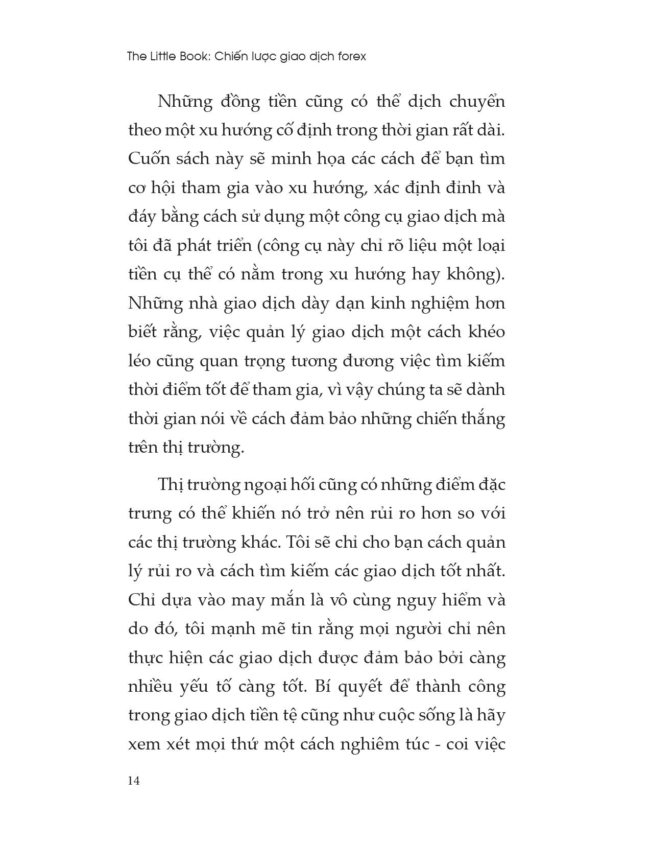 Với “The Little Book: Chiến lược giao dịch forex”, bạn sẽ biết được những yếu tố tác động đến tiền tệ cũng như các chiến lược để thu lợi nhuận từ những yếu tố đó. Sách cũng tiết lộ phương pháp giao dịch các loại tiền tệ khác nhau để giảm rủi ro và tận dụng khéo léo các xu hướng toàn cầu. Bằng cách xây dựng một kế hoạch chỉn chu, bạn hoàn toàn có thể kiếm tiền mà không cần phải theo dõi các biểu đồ suốt cả ngày.
