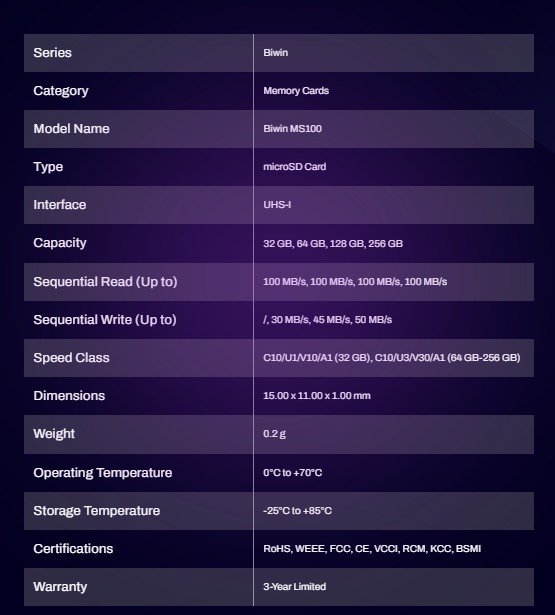 Thẻ nhớ microSD Biwin MS100   Biwin MS100 là dòng thẻ nhớ microSD 3.0 thế hệ mới, cung cấp khả năng lưu trữ hiệu suất cao với dung lượng lên đến 256GB, mang lại không gian rộng rãi cho hình ảnh, video, ứng dụng khác, v.v. Được thiết kế để sử dụng hàng ngày và các ứng dụng có nhu cầu cao, thẻ đảm bảo tốc độ truyền dữ liệu nhanh để ghi âm, phát trực tuyến và đa nhiệm liền mạch. Tương thích với nhiều loại thiết bị, đây là giải pháp linh hoạt cho nhu cầu lưu trữ của bạn.   Tốc độ cao cho nhịp sống hiện đại Có xếp hạng UHS-I U3 và V30, thẻ nhớ Biwin MS100 cung cấp tốc độ đọc lên đến 100 MB/s để chụp ảnh và video độ nét cao. Bạn có thể tiết kiệm thời gian nhiều hơn, tập trung vào sự sáng tạo hơn. Với Biwin MS100, bạn được trang bị để ghi âm mượt mà, không bị gián đoạn và truyền tệp nhanh chóng, biến tầm nhìn sáng tạo của bạn thành hiện thực với tốc độ và độ tin cậy.   Đáp ứng đa dạng nhu cầu sử dụng   Thẻ nhớ Biwin MS100 dùng được cho nhiều thiết bị khác nhau, bao gồm điện thoại thông minh, máy tính bảng, camera an ninh gia đình, camera hành trình, v.v. Dù trong công việc hay cuộc sống, chiếc thẻ nhớ microSD này cũng sẽ là người bạn đồng hành lý tưởng. Với khả năng tương thích rộng rãi, Biwin MS100 đáp ứng đa dạng nhu cầu của bạn, nâng cao trải nghiệm của bạn trong cả môi trường cá nhân và chuyên nghiệp.   Bền bỉ và đáng tin cậy Biwin MS100 được thiết kế để chịu được các yếu tố môi trường khắc nghiệt, bao gồm nhiệt độ khắc nghiệt, bụi, va đập và tia X. Thẻ nhớ là lựa chọn cho những nhà thám hiểm, nhiếp ảnh gia và bất kỳ ai ghi hình ngoài trời hoặc làm việc trong điều kiện khắc nghiệt, đảm bảo các tệp có giá trị của bạn được an toàn và nguyên vẹn.   Bảo hành lên đến 3 năm   Thẻ nhớ microSD MS100 của BIWIN trải qua quá trình thử nghiệm nghiêm ngặt để đáp ứng các tiêu chuẩn chất lượng nghiêm ngặt về hiệu suất, độ bền và tính toàn vẹn của dữ liệu. Được bảo hành 3 năm, giúp bạn an tâm khi sử dụng và thoải mái lưu trữ cho mọi dự án lớn nhỏ của mình.