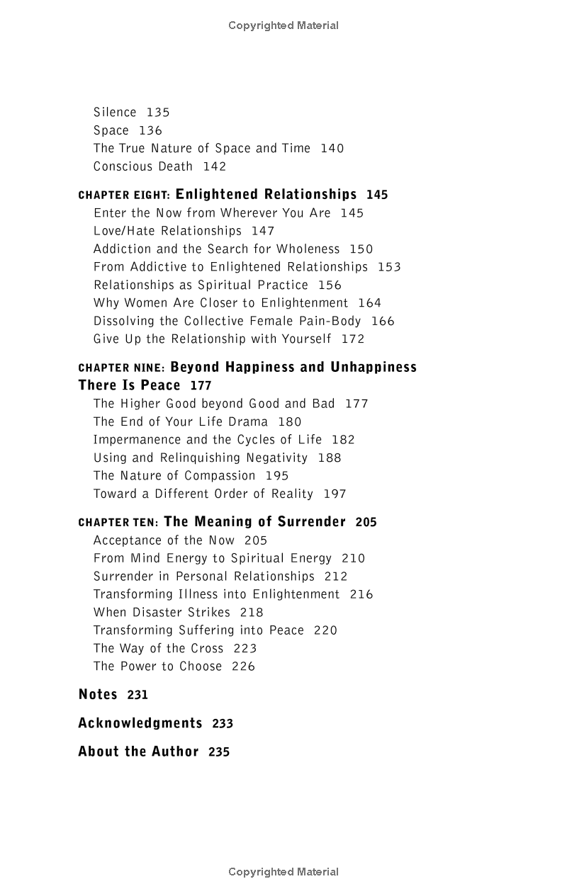 In the first chapter, Tolle introduces readers to enlightenment and its natural enemy, the mind. He awakens readers to their role as a creator of pain and shows them how to have a pain-free identity by living fully in the present. The journey is thrilling, and along the way, the author shows how to connect to the indestructible essence of our Being, "the eternal, ever-present One Life beyond the myriad forms of life that are subject to birth and death."