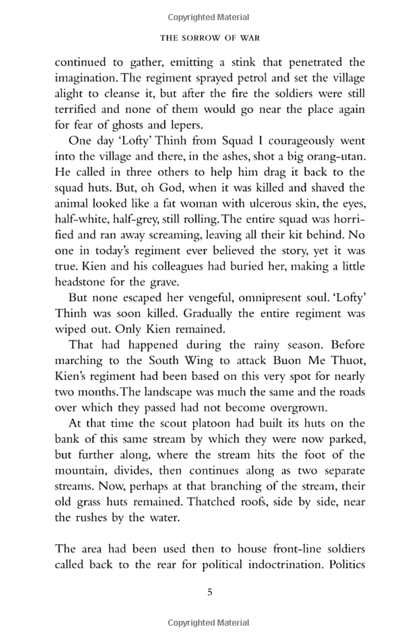 The Sorrow Of War Kien’s job is to search the Jungle of Screaming Souls for corpses. He knows the area well - this was where, in the dry season of 1969, his battalion was obliterated
