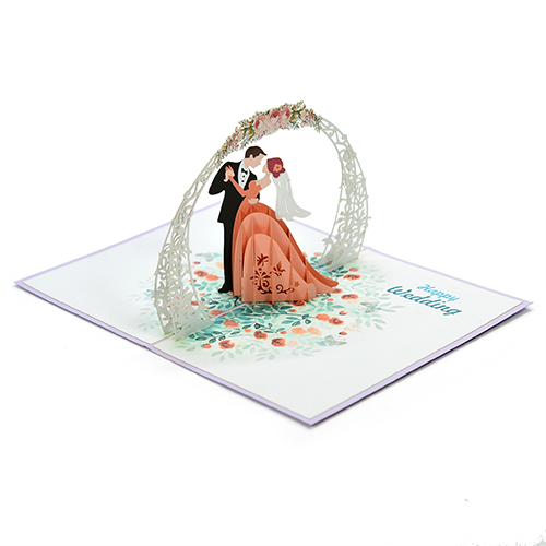 Gửi lời chúc phúc ngọt ngào với thiệp 3D Pop Up cô dâu chú rể. Khi mở ra, hình ảnh đôi uyên ương trong trang phục cưới lộng lẫy bật nổi dưới cổng hoa tinh