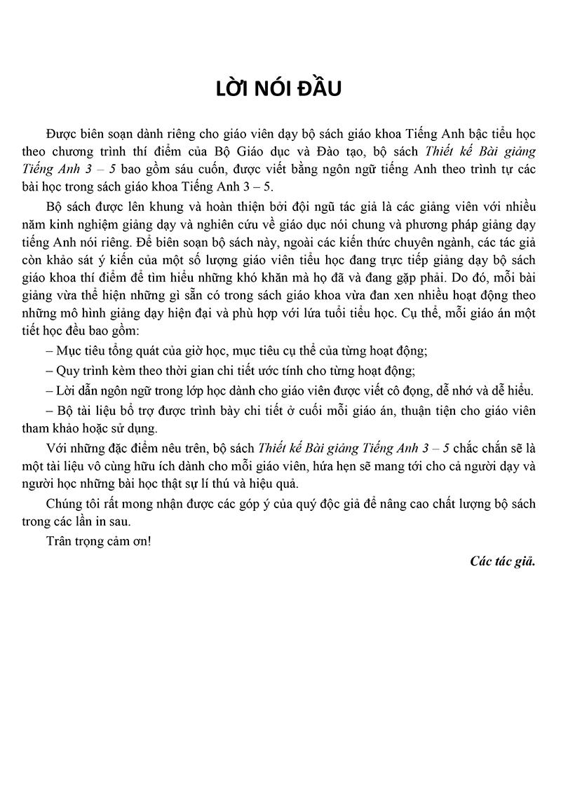 Với những đặc điểm trên, Thiết kế bài giảng Tiếng Anh 3 sẽ là bộ tài liệu hữu ích cho giáo viên và học sinh.