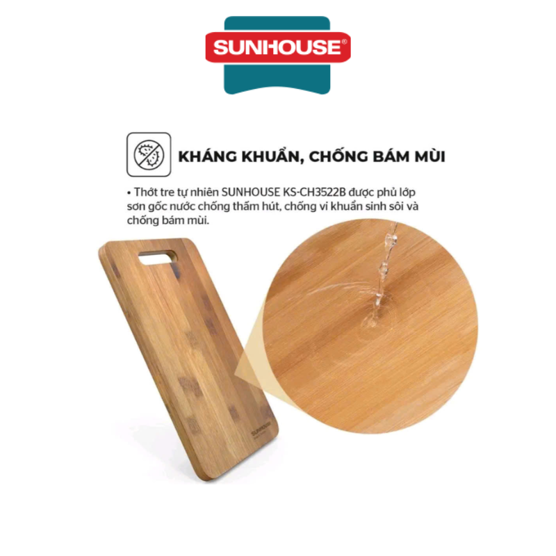 Bề mặt thớt tre tự nhiên SUNHOUSE KS-CH2626B được phủ lớp sơn gốc nước- loại sơn an toàn khi tiếp xúc thực phẩm. Lớp sơn gốc nước không màu, không mùi giúp bề mặt thớt bền bỉ, hạn chế thấm hút tối đa từ đó chống vi khuẩn sinh sôi và chống bám mùi hiệu quả. Gia đình bạn hoàn toàn có thể tái sử dụng thớt tre tự nhiên SUNHOUSE KS-CH2626B sau khi rửa sạch và phơi khô. Thiết kế đặc biệt này cũng giúp thớt tre tự nhiên SUNHOUSE nhanh khô sau khi rửa, tiện dụng khi vệ sinh thớt.