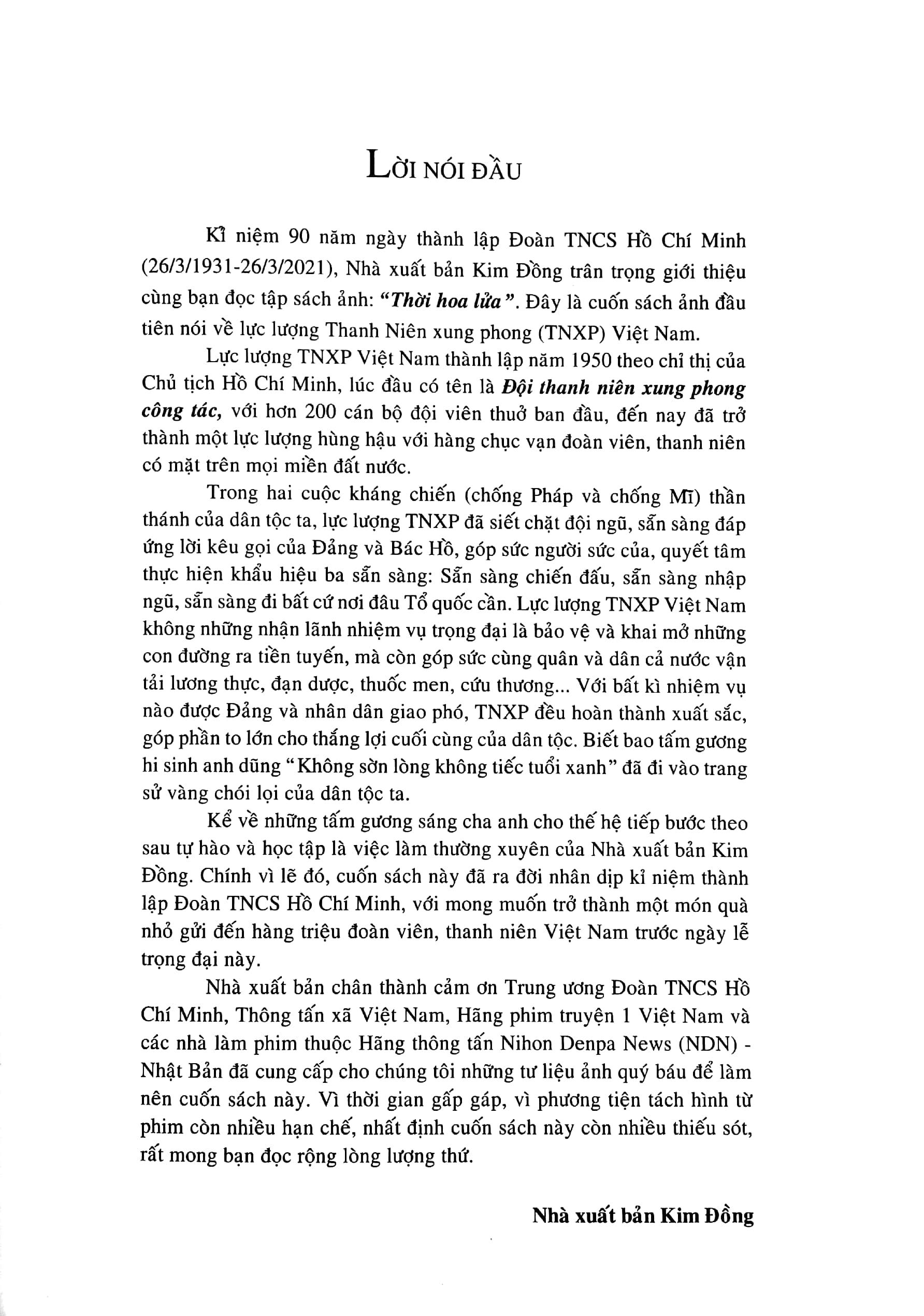Kỉ niệm 90 năm ngày thành lập Đoàn Thanh niên Cộng sản Hồ Chí Minh (1931-2021), Nhà xuất bản Kim Đồng tái bản cuốn sách ảnh Thời Hoa Lửa ghi lại những giây phút, khoảnh khắc làm nên những bông hoa giữa tuyến lửa của Thanh niên xung phong từ ngày đầu thành lập năm 1950.