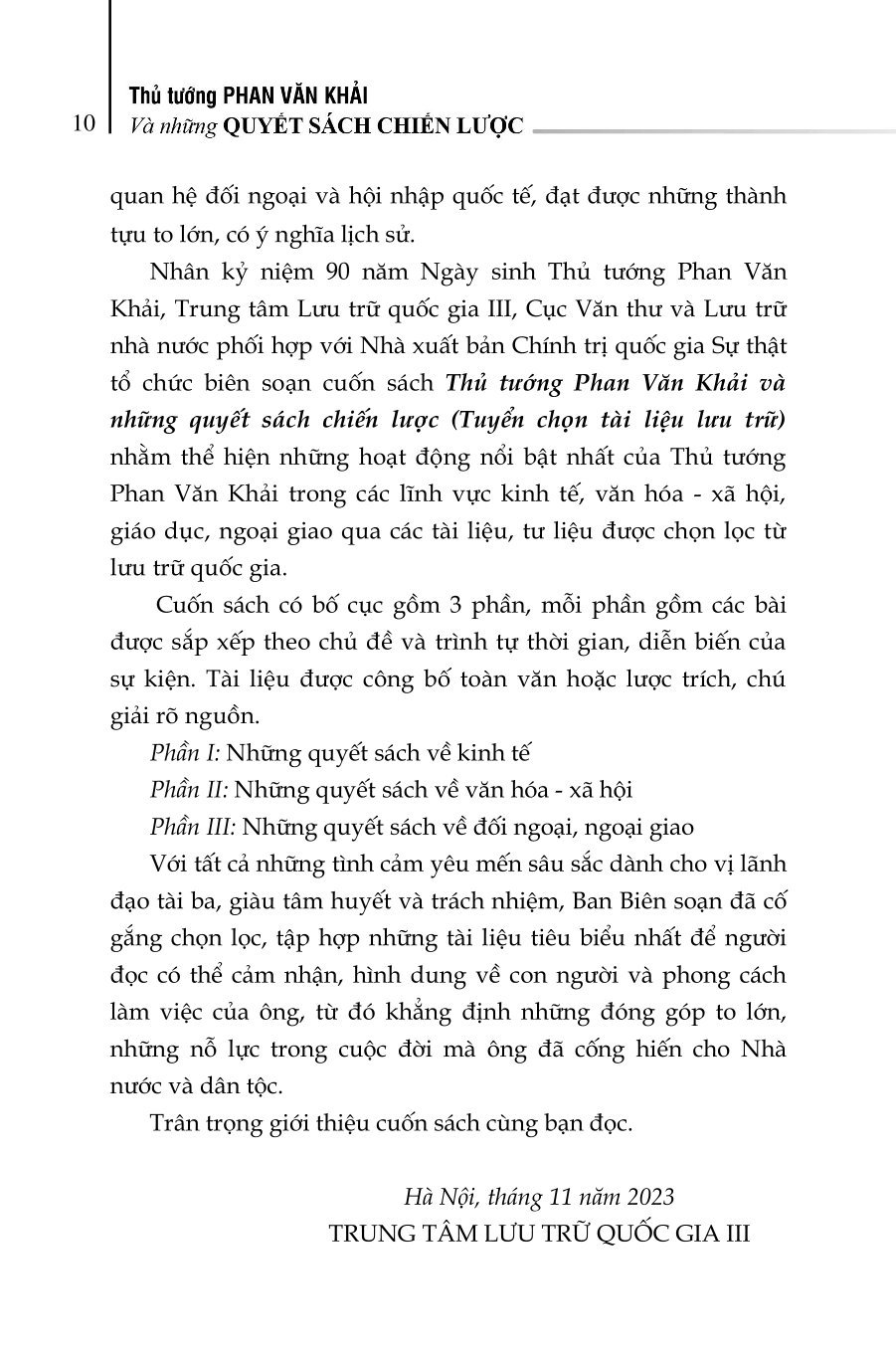 Nhằm làm rõ những quyết sách chiến lược và đóng góp của đồng chí Phan Văn Khải vào thành tựu chung của đất nước, Nhà xuất bản Chính trị quốc gia Sự thật tái bản cuốn sách Thủ tướng Phan Văn Khải và những quyết sách chiến lược (Tuyển chọn tài liệu lưu trữ).