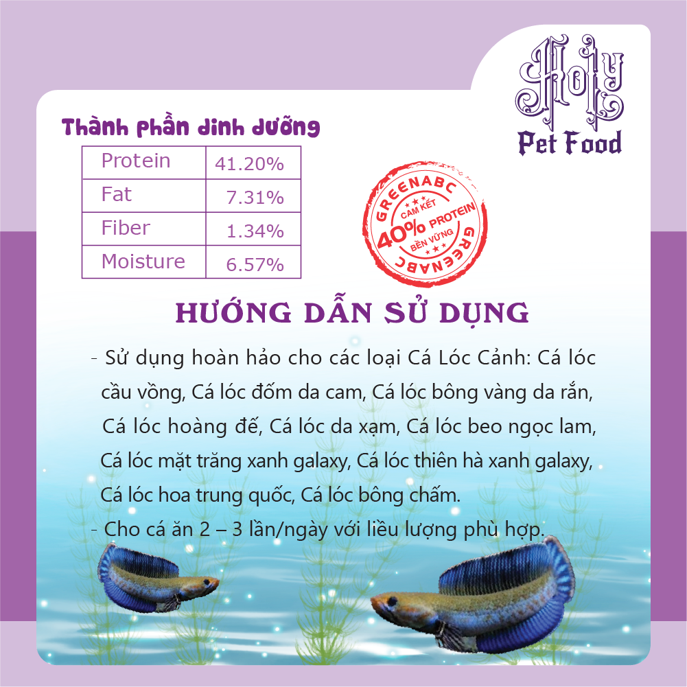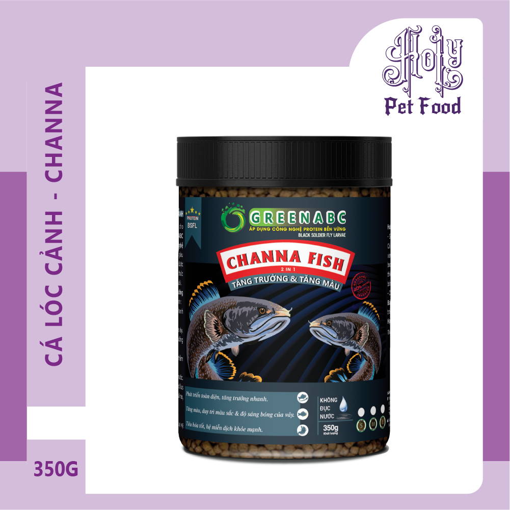 GREENABC là thức ăn cao cấpdành cho CÁ LÓC CẢNH. Đặc biệt sản phẩm GREENABC được sản xuất theo phương pháp Áp dụng công nghệ PROTEIN bền vững từ bột đạm G.Meal rất giàu PROTEIN – CANXI – LIPID có trong BSFL, đã được Mỹ (AAFCO) và EU chấp nhận đưa vào công thức cho ngành sản xuất thức ăn cho vật nuôi.