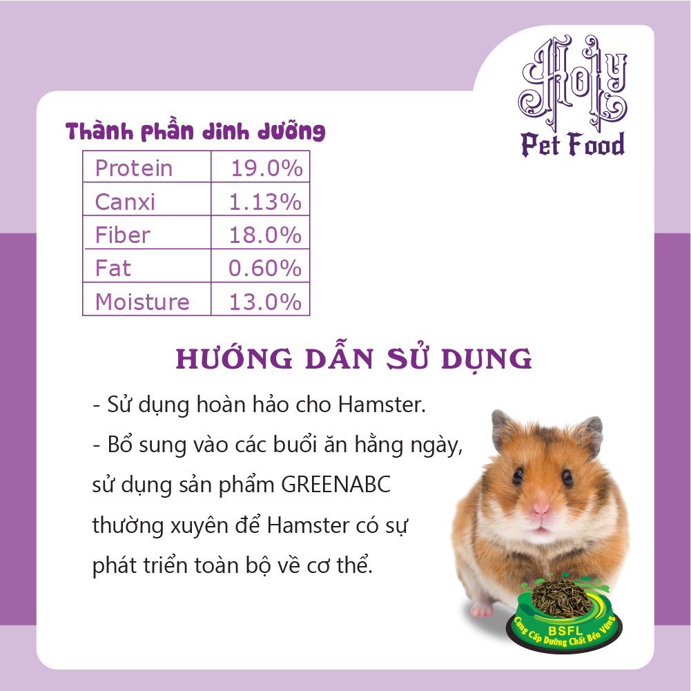 GREENABC là thức ăn cao cấp dành cho HAMSTER. Đặc biệt sản phẩm GREENABC được sản xuất theo phương pháp Áp dụng công nghệ PROTEIN bền vững rất giàu PROTEIN – CANXI – LIPID có trong BSFL, đã được Mỹ (AAFCO) và EU chấp nhận đưa vào công thức cho ngành sản xuất thức ăn dành cho vật nuôi.