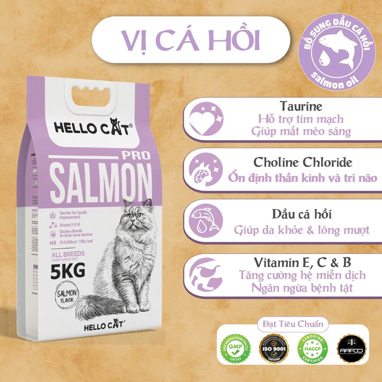 THỨC ĂN CHO MÈO HELLO CAT SALMON 5KG Quy cách đóng gói: Bao xá 5kg Dành cho mèo trên 12 tháng tuổi Thành phần dinh dưỡng: - Protein thô: 30.0% (tối thiểu); - Chất béo