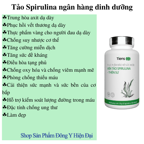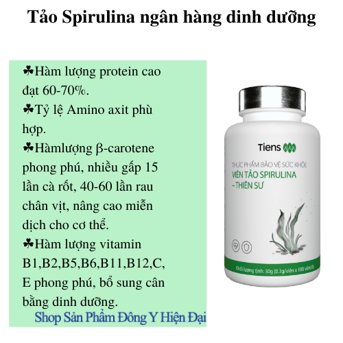 - 6 Tảo Spirulina với dinh dưỡng trẻ em Tảo Spirulina có dinh dưỡng toàn diện, phong phú, dễ hấp thụ, là biện pháp nhanh nhất bổ sung dinh dưỡng một cách khoa học cho trẻ em. Thực phẩm bảo vệ sức khoẻ viên tảo Spirulina Thiên Sư là thực phẩm chức năng có nguyên liệu được làm từ bột tảo khô thuần thiên nhiên chất lượng cao. Có tác dụng tăng cường khả năng chịu đựng trong môi trường thiếu oxy và điều tiết miễn dịch Hướng dẫn sử dụng: Ngày uống 2-3 lần, mỗi lần 6 viên. Uống với nước ấm. Bảo quản: Để ở nơi khô mát, tránh ánh nắng sáng.