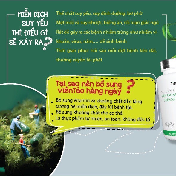 - 1 Tăng cường sức đề kháng Tảo Spirulina giúp nâng cao khả năng chống lại bệnh tật cho cơ thể, nhanh chóng phục hồi và nâng cao thể lực, có tác dụng thúc đẩy cơ thể sản sinh các tế bào máu mới. Chất chiết xuất đặc biệt từ tảo Spirulina còn có khả năng ngăn chặn các bệnh AIDS, virut Herpes, virut cúm, quai bị, sởi