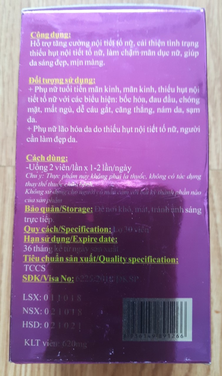 Mua tại TiktokQuy Cách Đóng Gói: Hộp 30 viên Công dụng : Hỗ trợ tăng cường nội tiết tố nữ, giảm các biểu hiện thiếu hụt nội tiết tố estrogen ở phụ nữ tiền mãn kinh, mãn kinh, suy giảm chức năng sinh lý nữ. Hỗ trợ giảm nám, tàn nhang, hỗ trợ da sáng đẹp, mịn màng. Đối tượng sử dụng: