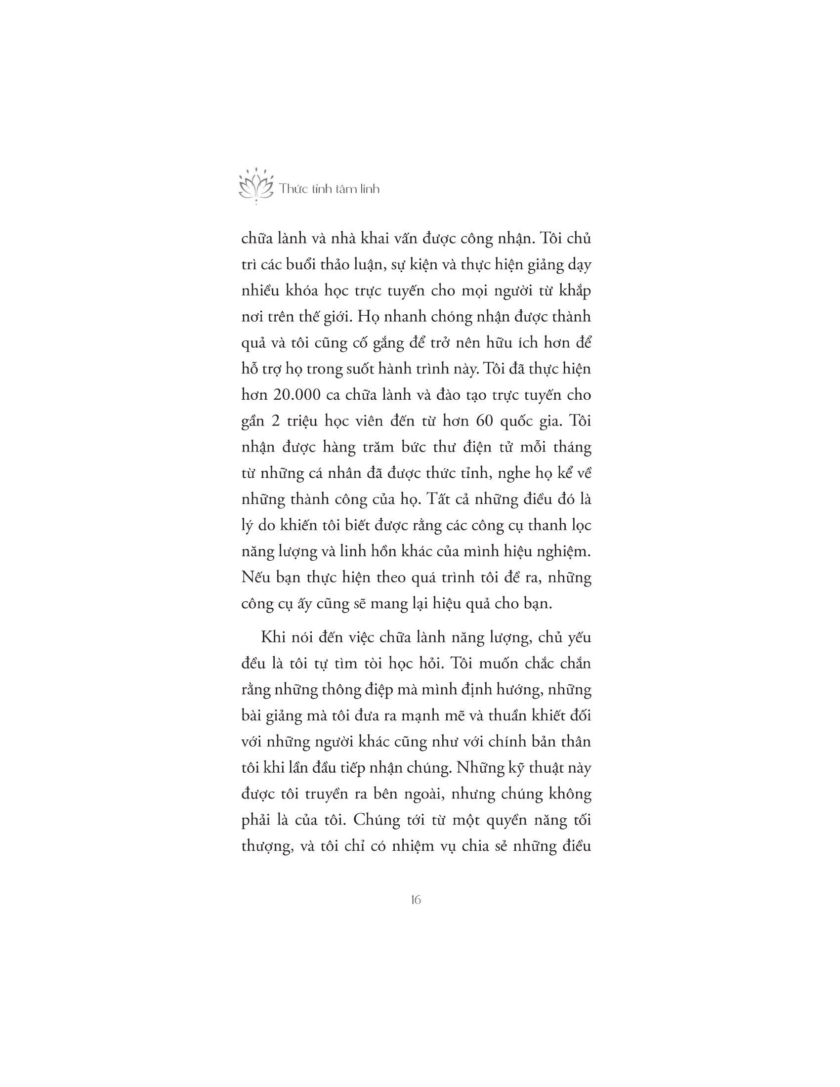 Hãy để Thức tỉnh tâm linh – Đánh thức năng lượng bản thân, khai mở tâm trí, thu hút tiền bạc, sống đời trọn vẹn dẫn dắt bạn vào hành trình thức tỉnh tâm trí trong 15 ngày để đánh thức những tài năng tiềm ẩn ấy. Sử dụng món quà của bản thân vì chính m.ình và vì mọi người là mục tiêu cao cả nhất, không chỉ thay đổi cuộc sống của bạn mà còn cả của những người xung quanh theo chiều hướng tốt đẹp hơn.