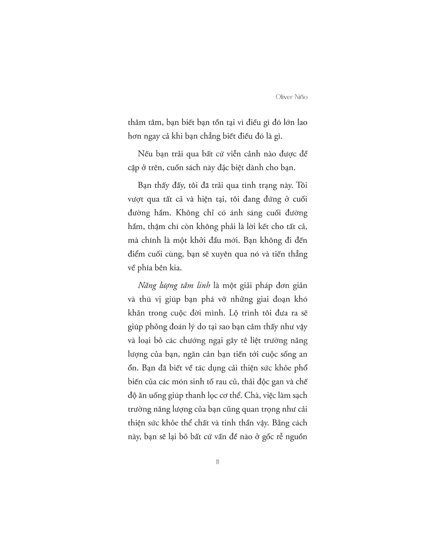 Sau nhiều năm thực hiện công việc tư vấn và chữa lành cho hàng nghìn khách hàng khác nhau, tác giả Oliver Niño đã đúc kết các kinh nghiệm sử dụng thiền, khai mở luân xa và nâng cao tần số rung cảm để cải thiện sức khỏe và cuộc sống của m.ình thành một bảng hướng dẫn chi tiết nhất về quá trình tự chữa lành và khai phá tiềm năng của bản thân chỉ trong 15 ngày. Cuốn sách này sẽ hướng dẫn chi tiết cách tìm kiếm gốc rễ của những vấn đề đang kìm kẹp bạn, hay chính là những cảm xúc tiêu cực, những ám ảnh trong quá khứ, thậm chí chúng có thể bắt nguồn từ thời ông bà của bạn di truyền lại; sau đó học cách bảo vệ tâm trí khỏi những ký ức này và từng bước sống tích cực để duy trì một trường năng lượng cao hơn. Ở tần số năng lượng cao, bạn có thể chữa lành bản thân cũng như kêu gọi một tương lai tươi sáng hơn cùng với những con người, sự việc có chung mức tần số cao đó.