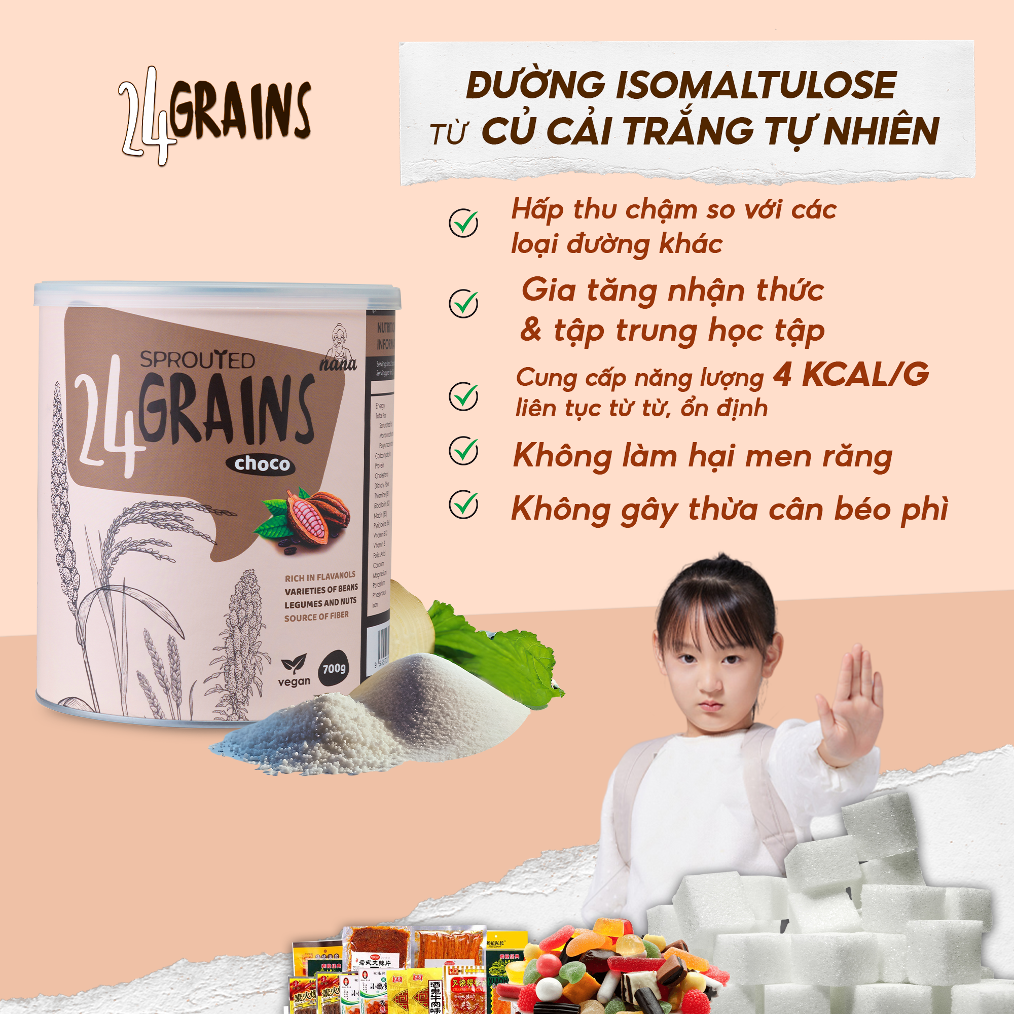 Vị ngọt tự nhiên - chiết suất từ củ cải trắng: chỉ số GI thấp, an toàn, hàm lượng chất xơ cao, hàm lượng tinh bột kháng và polyphenol cao, giúp tăng cường tiêu hóa, hấp thu và hạn chế các nguy cơ béo phì, dậy thì sớm