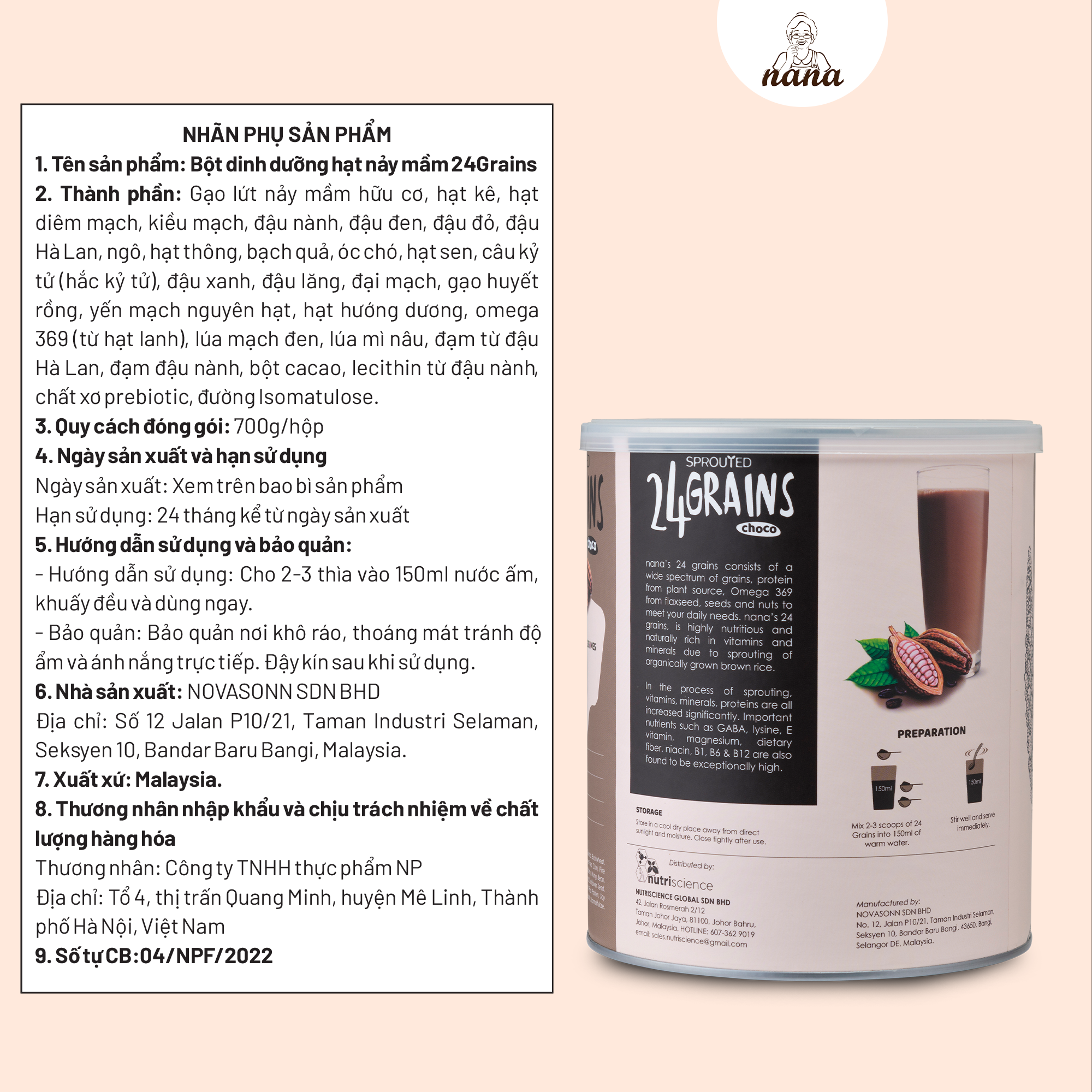 Thành phần: Gạo lứt hữu cơ nảy mầm, hạt kê, hạt diêm mạch, kiều mạch, đậu đen, đậu đỏ, ngô, hạt thông, bạch quả, óc chó, hạt sen, câu kỷ tử, đậu xanh, đậu lăng, đại mạch, gạo huyết rồng, yến mạch nguyên hạt, hạt hướng dương, omega 369 (từ hạt lanh), lúa mạch đen, lúa mì nâu, protein từ đậu Hà Lan, bột cacao, lecithin từ đậu nành, chất xơ prebiotic, isomaltulose.