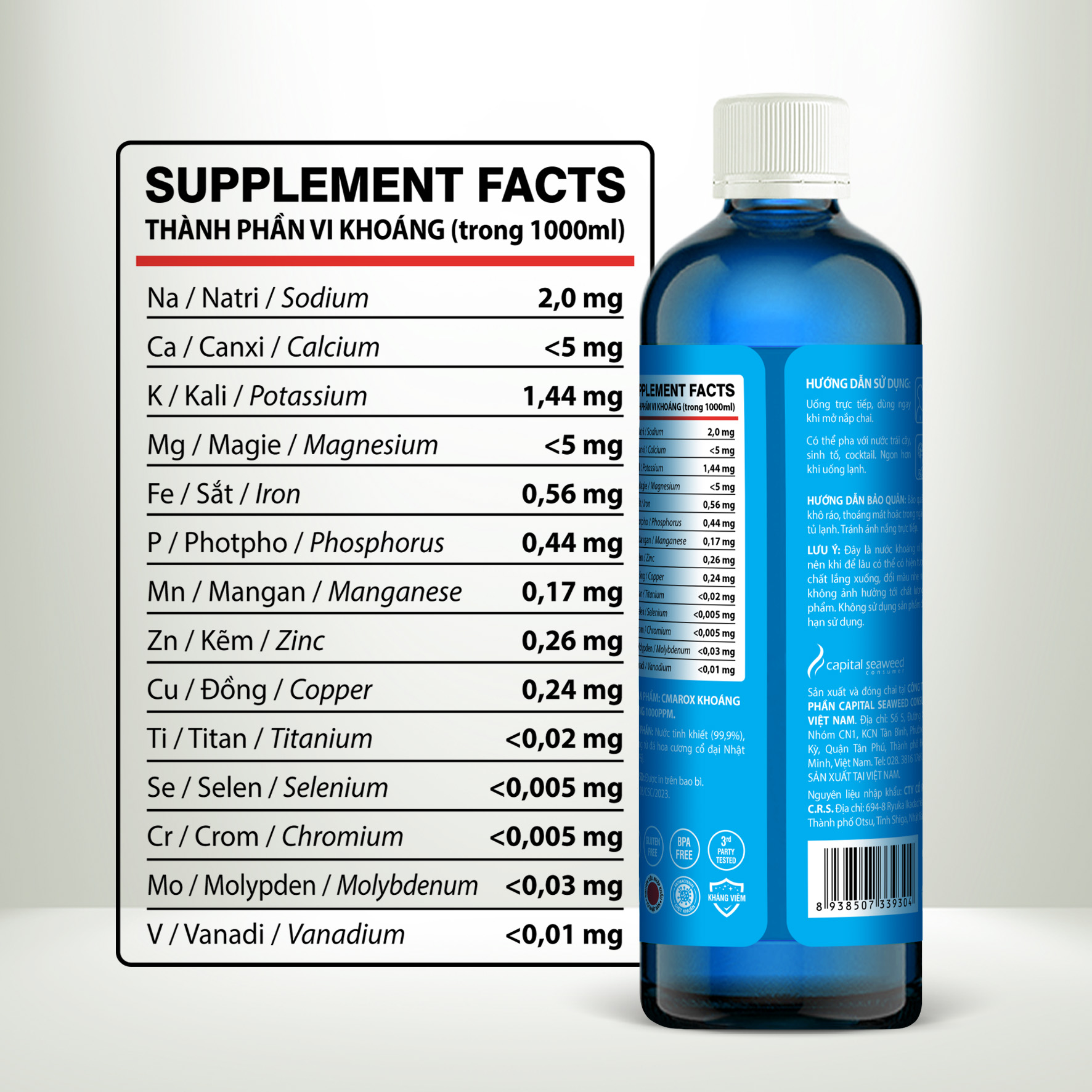 CMAROX CHAI 500ml với nồng độ khoáng vi lượng 1.000ppm CMAROX chứa hơn 36 loại khoáng chất vi lượng thiết yếu ở dạng ion, cần thiết cho việc duy trì sức khỏe của con người