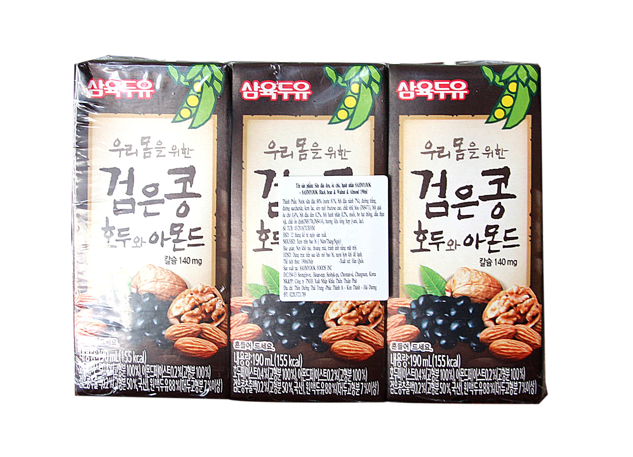 Thành phần dinh dưỡng nước đậu đen, hạnh nhân, óc chó Sahmyook: - Sữa đậu nành đen 90% - đậu nành nhập khẩu, chất đạm đậu nành trên 7%. Đường trắng, đường mạch nha maltooligo