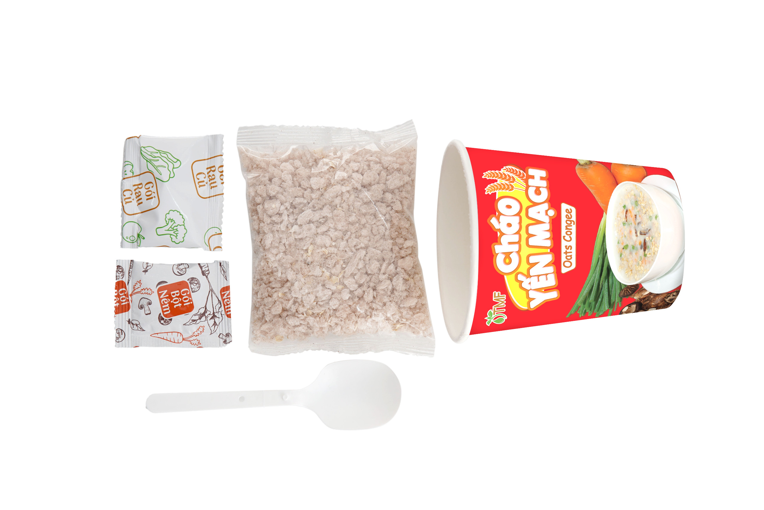 *Thành phần: - Yến mạch nguyên chất (60%), phôi cháo gạo. Gói rau củ: nấm đông cô sấy thăng hoa (2%); cà rốt, paro, ngò rí sấy thăng hoa. - Gói soup bột: hạt nêm