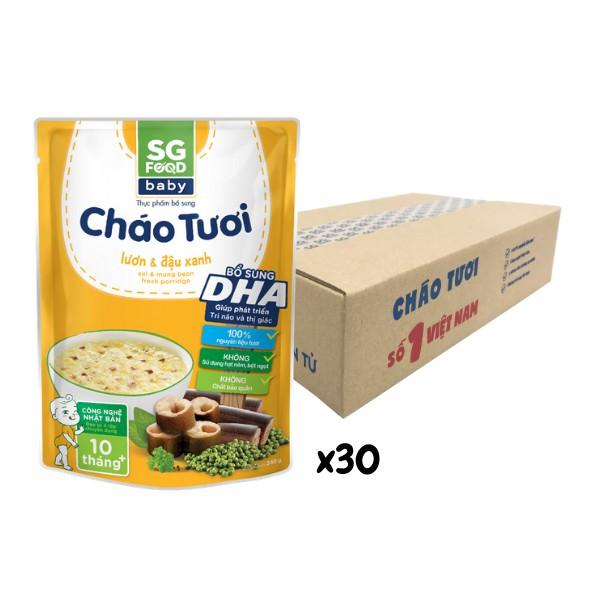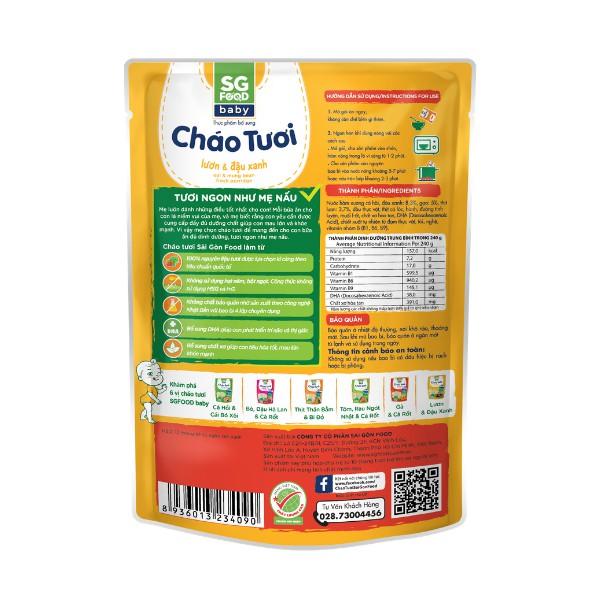 Cháo tươi SGF Baby Lươn & Đậu xanh là vị cháo được các bé yêu thích. Sử dụng 100% nguyên liệu tự nhiên giàu dinh dưỡng từ lươn, đậu xanh, … bổ sung DHA, chất xơ hòa tan và Vitamin nhóm B (B1, B6, B12) ngoài ra cháo được nấu từ nước hầm xương cá hồi mang đến vị ngọt tự nhiên và dinh dưỡng cho bé.
