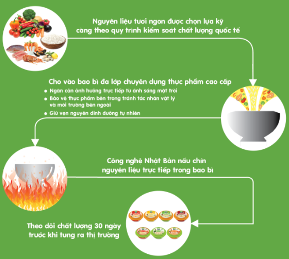Không chất bảo quản nhờ bao bì đa lớp chuyên dụng kết hợp Công nghệ Nhật Bản nấu chín trực tiếp nguyên liệu trong bao bì.