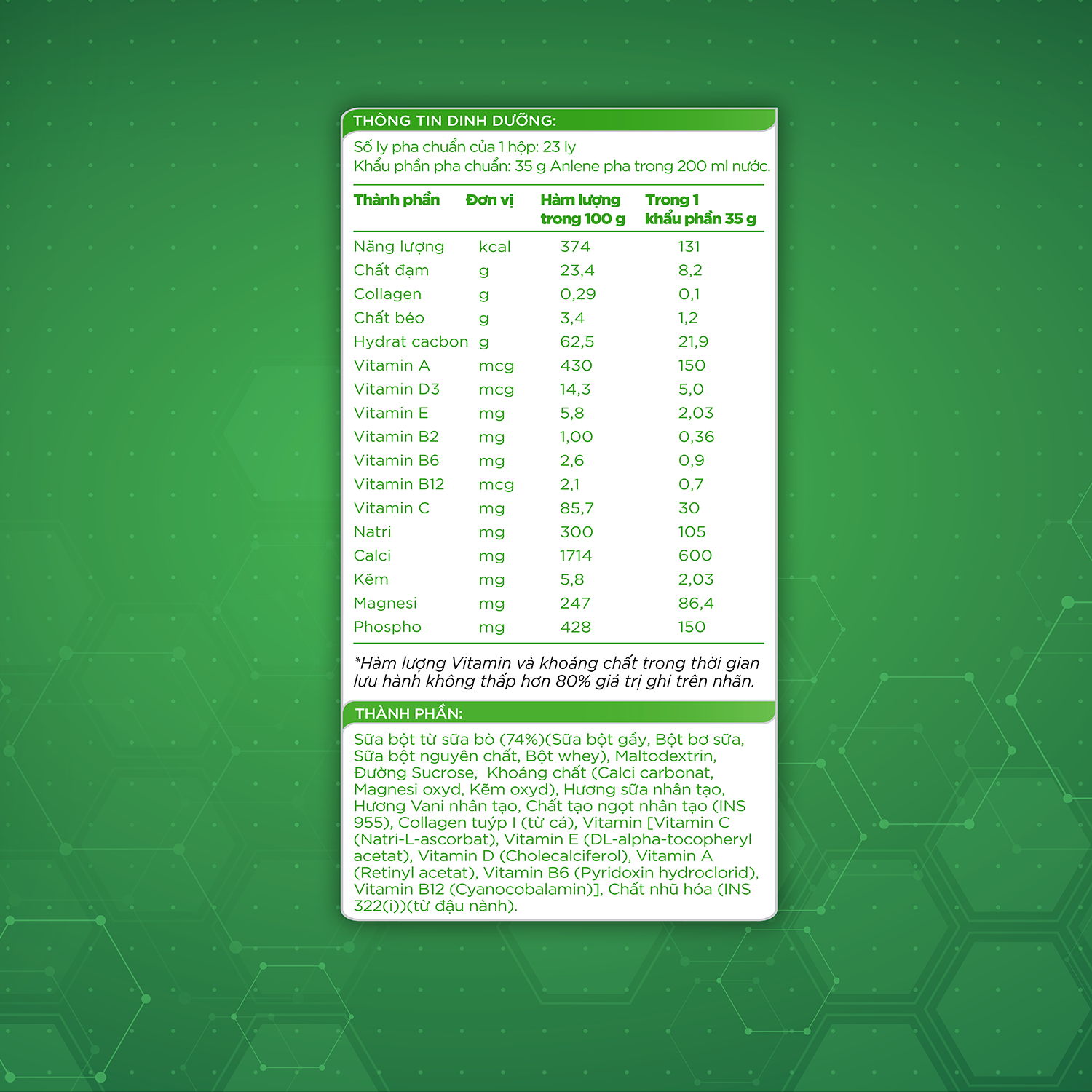 - Hai hộp Anlene cung cấp 100% nhu cầu canxi và 100% nhu cầu vitamin D3 cho cơ thể. Như vậy, sản phẩm không chỉ cung cấp canxi, mà còn cung cấp nhiều khoáng chất cần thiết cho xương. (theo Xác Nhận Công Bố Phù Hợp Quy Định An Toàn Thực Phẩm số 22060/2017/ATTP-XNCB - cấp bởi Cục An Toàn Thực Phẩm - Bộ Y Tế)