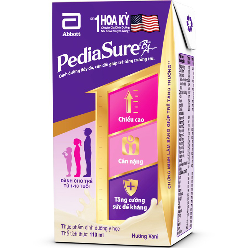 - Sữa Nước Pediasure Vani 110ml dành cho trẻ 1-10 tuổi, bao gồm trẻ tăng trưởng kém (nhẹ cân, thấp còi, suy dinh dưỡng, hay ốm), trẻ biếng ăn, trẻ có nhu cầu năng lượng