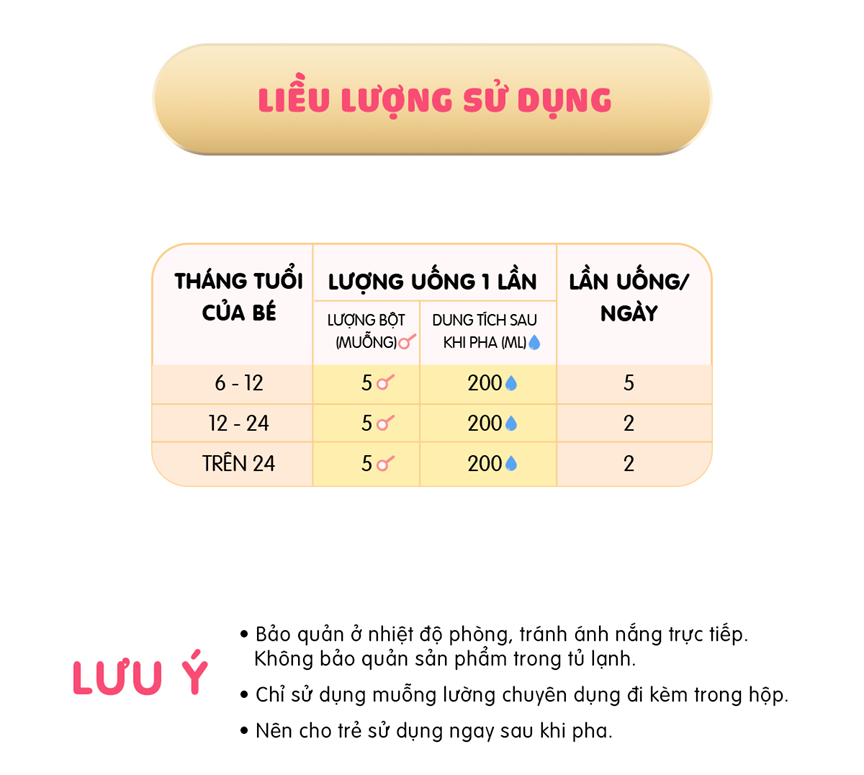 Lưu ý: Vệ sinh sạch dụng cụ pha và sử dụng nước đun sôi để nguội 50℃. 1 muỗng gạt ngang pha được 40ml thành phẩm ( gồm sữa + nước).