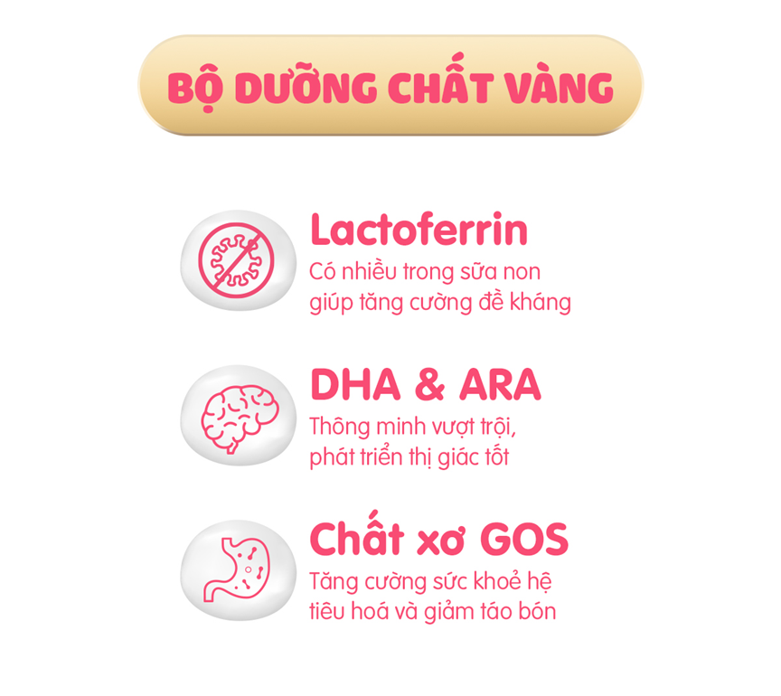 Bổ sung tiền lợi khuẩn Bifidus(Lactose và Raffinose) giúp tăng cường lợi khuẩn, hỗ trợ tiêu hóa và ngăn ngừa táo bón.