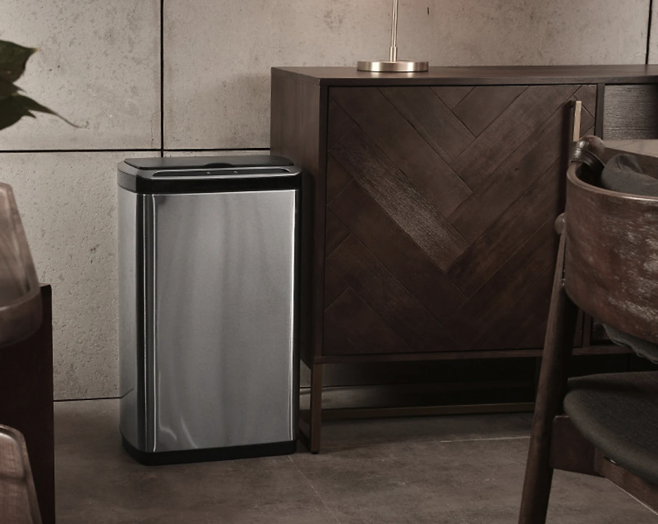Hình dạng mỏng và bản lề vô hình của thùng rác này làm cho nó hoàn hảo trong không gian chật hẹp. Khe đựng túi nilong tích hợp bên trong giúp việc thay túi nilong