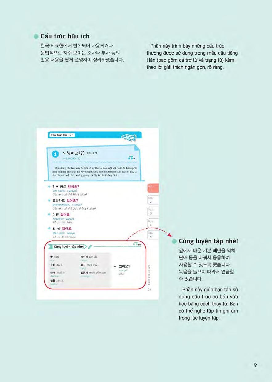 Tiếng Hàn Tổng Hợp Dành Cho Người Việt Nam - Sơ Cấp 1 Trong những năm gần đây, nhu cầu học tiếng Hàn và tìm hiểu về văn hóa Hàn Quốc đang có xu hướng tăng lên. Người học tiếng Hàn rất mong muốn có được một bộ giáo trình chuẩn, được biên soạn một cách tỉ mỉ và hữu ích nhất. Giáo trình tiếng Hàn tổng hợp lần đầu tiên được trao bản quyền chính thức tại Việt Nam Hiểu được điều đó, ngày 4-7, Đại diện chính phủ Hàn Quốc, ngài Woo Hyeong Min – Trưởng đại diện Văn phòng Quỹ giao lưu Quốc tế HQ tại Việt Nam cùng GS.TS.NGƯT Mai Ngọc Chừ – Chủ tịch Hội Nghiên cứu khoa học về Hàn Quốc của Việt Nam (KRAV) đã trao quyết định cho phép Công ty Cổ phần sách MCBooks của Việt Nam được xuất bản cuốn sách này tại thị trường Việt Nam. Và đây chính là bộ giáo trình tiếng Hàn tổng hợp đầu tiên có bản quyền chính thức có mặt tại Việt Nam. Cũng theo ông Woo Hyeong Min, Thực tế đây là bộ giáo trình chính thống mà tất cả người học tiếng Hàn tại Việt Nam cần sử dụng. Tuy nhiên nhiều năm qua bộ sách đến tay người dùng đều là sách lậu nên chưa đạt được kết quả mà chính phủ Hàn muốn mang tới Việt Nam. Do đó Chính phủ Hàn Quốc đã quyết định tìm 1 đơn vị xuất bản uy tín của Việt Nam để giúp họ mang đến cho người học những cuốn sách tiếng Hàn chất lượng tốt với giá cả hợp lý. Bộ giáo trình được Hội nghiên cứu khoa học Hàn Quốc của Việt Nam biên soạn và hiệu đính. Bộ giáo trình sẽ giúp nâng cao hiệu quả trong việc sử dụng ngôn ngữ Hàn sau tiếng mẹ đẻ và tiếng Anh, là nền tảng giúp người lao động Việt Nam nhận được những vị trí làm việc cao trong doanh nghiệp Hàn Quốc. Đây cũng là cách để thúc đẩy quan hệ hợp tác về văn hoá và giáo dục giữa hai nước trong thời gian tới. Giới thiệu cuốn Giáo trình tiếng Hàn tổng hợp dành cho người Việt Nam – Sơ cấp 1 Giáo trình tiếng Hàn tổng hợp dành cho người Việt Nam – Sơ cấp 1 được biên soạn dành cho người Việt Nam muốn học tiếng Hàn ở trình độ sơ cấp. Sách được biên soạn nhằm hướng tới việc sử dụng được trong các tiết học tiếng Hàn tại giảng đường đại học nên mỗi bài học được chia thành nhiều phần như: Lý thuyết cơ bản gồm từ vựng và cấu trúc ngữ pháp; phần luyện tập theo 4 kỹ năng giao tiếp như: Nghe – Nói – Đọc – Viết, phần luyện phát âm, phần tìm hiểu văn hóa… Các chủ đề trong sách được sắp xếp một cách có hệ thống và liên quan chặt chẽ với nhau. Giáo trình tiếng Hàn tổng hợp được biên soạn kèm theo một cuốn sách bài tập hỗ trợ giúp người học ôn tập kỹ hơn và có thể luyện tập nâng cao trong những trường hợp cần thiết. Nội dung trong Giáo trình tiếng Hàn tổng hợp – Sơ cấp 1 2 cuốn sách trong bộ Sơ cấp được xây dựng với 30 bài khóa và bảng chữ cái. Trong đó quyển 1 gồm phần bảng chữ cái và 15 bài đầu. Học hết quyển 1, bạn sẽ học đến quyển sơ cấp 2 với 15 bài còn lại. Cấu trúc tổng thể của giáo trình được xây dựng theo các chủ đề; mỗi chủ đề được liên kết thống nhất với một hệ thống các từ vựng và cấu trúc ngữ pháp cơ bản, bài tập ứng dụng, kỹ năng và tìm hiểu văn hóa. Trong mỗi bài học, nội dung học được chia thành các phần như: luyện từ vựng, luyện ngữ pháp cơ bản, luyện tập kỹ năng nghe – nói – đọc – viết, luyện phát âm, tìm hiểu văn hóa của đất nước Hàn Quốc xinh đẹp. Và kết thúc mỗi bài đều có thêm bảng từ mới xuất hiện trong bài học. Phần cuối của sách, các tác giả đưa ra hệ thống từ mới được sắp xếp theo thứ tự của bảng chữ cái. Đây là những từ không xuất hiện trong phần ngữ pháp, từ vựng cơ bản; nhưng lại xuất hiện nhiều ở phần luyện tập của từng bài.