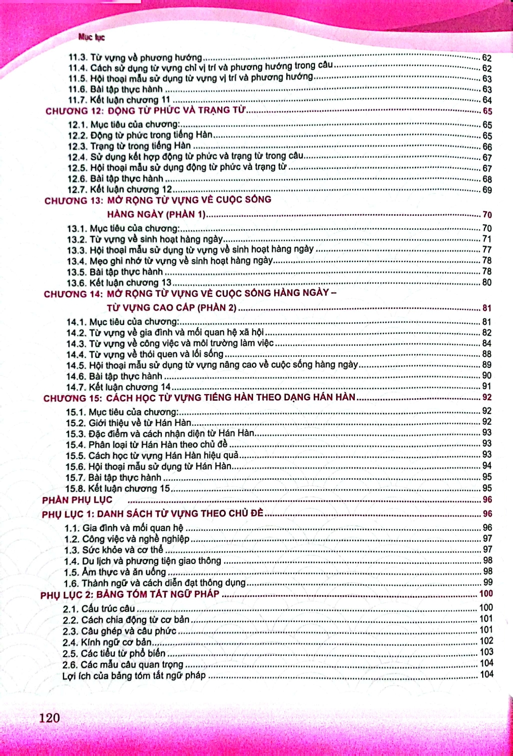 Nội dung sách bao gồm các bài học về ngữ pháp, từ vựng và các mẫu hội thoại thực tế. Từng chương được xây dựng để bạn dần nắm vững các chủ điểm quan trọng như cách sử dụng câu phức, câu điều kiện, kính ngữ, và cách biểu đạt cảm xúc, suy nghĩ trong nhiều bối cảnh khác nhau. Bên cạnh đó, bạn sẽ được tiếp cận với các chủ đề phong phú về văn hóa Hàn Quốc, từ phong tục tập quán, lối sống, cho đến các giá trị truyền thống và hiện đại. Những kiến thức này không chỉ giúp bạn hiểu sâu hơn về ngôn ngữ mà còn kết nối với văn hóa và con người Hàn Quốc một cách chân thực hơn.