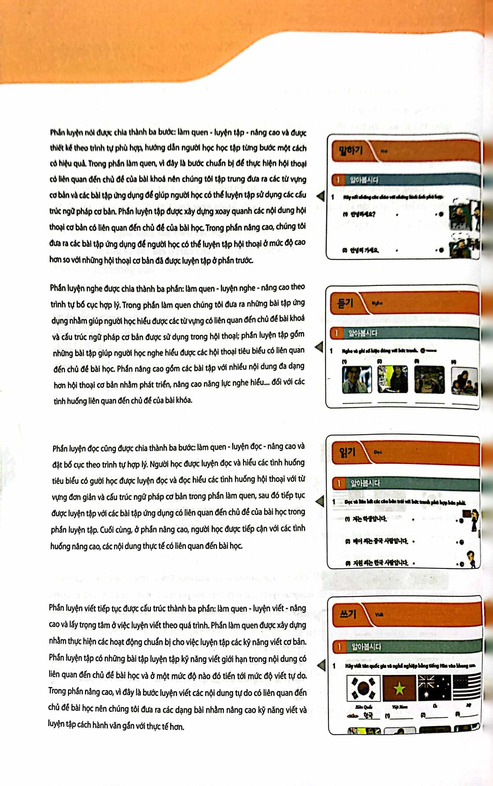 Tiếng Hàn Tổng Hợp Dành Cho Người Việt Nam - Sơ Cấp 1 - Sách Bài Tập Nếu bạn đã có trong tay cuốn Giáo trình tiếng Hàn tổng hợp dành cho người Việt Nam – sơ cấp 1 thì ngay lập tức phải sở hữu thêm cuốn sách bài tập này. Sách bài tập tiếng Hàn tổng hợp sơ cấp 1 được biên tập với mục đích nhằm hỗ trợ cho việc ôn tập và luyện tập nâng cao của những người học quyển Giáo trình tiếng Hàn tổng hợp sơ cấp 1. Sách bài tập sơ cấp 1 – bổ trợ cho Giáo trình tiếng Hàn tổng hợp được chia thành 3 phần chính sau đây: Phần 1: Luyện tập từ vựng. Phần này giúp cho người học ôn tập và luyện tập nâng cao trên cơ sở các từ vựng phù hợp với nội dung và chủ đề được học trong giáo trình chính. Phần 2: Phần luyện tập ngữ pháp giúp luyện tập các cấu trúc ngữ pháp cơ bản đã học trong giáo trình chính. Ngoài ra, bằng việc so sánh những cấu trúc ngữ pháp đã học trong giáo trình chính giúp người học có thể học ngữ pháp một cách có hệ thống. Phần 3: Phần ôn luyện tổng hợp các kỹ năng giao tiếp như: Nghe – Nói – Đọc – Viết. Đặc biệt trong phần này còn có những bài luyện đa dạng nhằm nâng cao năng lực hoạt động thực tế cho người học. Thông qua từng phần trong cuốn sách bài tập, người học sẽ được mở rộng phạm vi học tập từ vựng, ngữ pháp; có thể hiểu và thực hiện được những hội thoại thích hợp. Giáo trình tiếng Hàn tổng hợp dành cho người Việt Nam – Sách bài tập sơ cấp 1 Giáo trình tiếng Hàn tổng hợp dành cho người Việt Nam – Sơ cấp 1 được biên soạn dành cho người Việt Nam muốn học tiếng Hàn ở trình độ sơ cấp. Sách được biên soạn nhằm hướng tới việc sử dụng được trong các tiết học tiếng Hàn tại giảng đường đại học nên mỗi bài học được chia thành nhiều phần như: Lý thuyết cơ bản gồm từ vựng và cấu trúc ngữ pháp; phần luyện tập theo 4 kỹ năng giao tiếp như: Nghe – Nói – Đọc – Viết, phần luyện phát âm, phần tìm hiểu văn hóa…