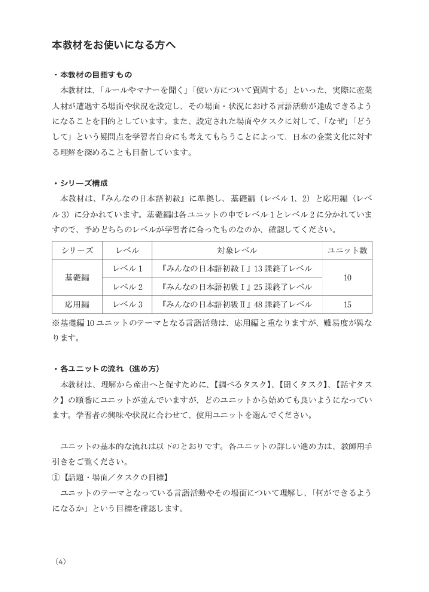 Giáo trình giúp học viên biết cách sử dụng tiếng Nhật chính xác trong các tình huống và bối cảnh thường gặp trong thực tế tại các công ty, nhà máy ở Nhật Bản. Ngoài ra, học viên cũng phát triển dần kỹ năng đặt vấn đề nghi vấn "tại sao", "như thế nào" đối với các tình huống, bối cảnh được đặt ra trong giáo trình, qua đó nắm bắt sâu sắc hơn về văn hóa doanh nghiệp Nhật Bản.