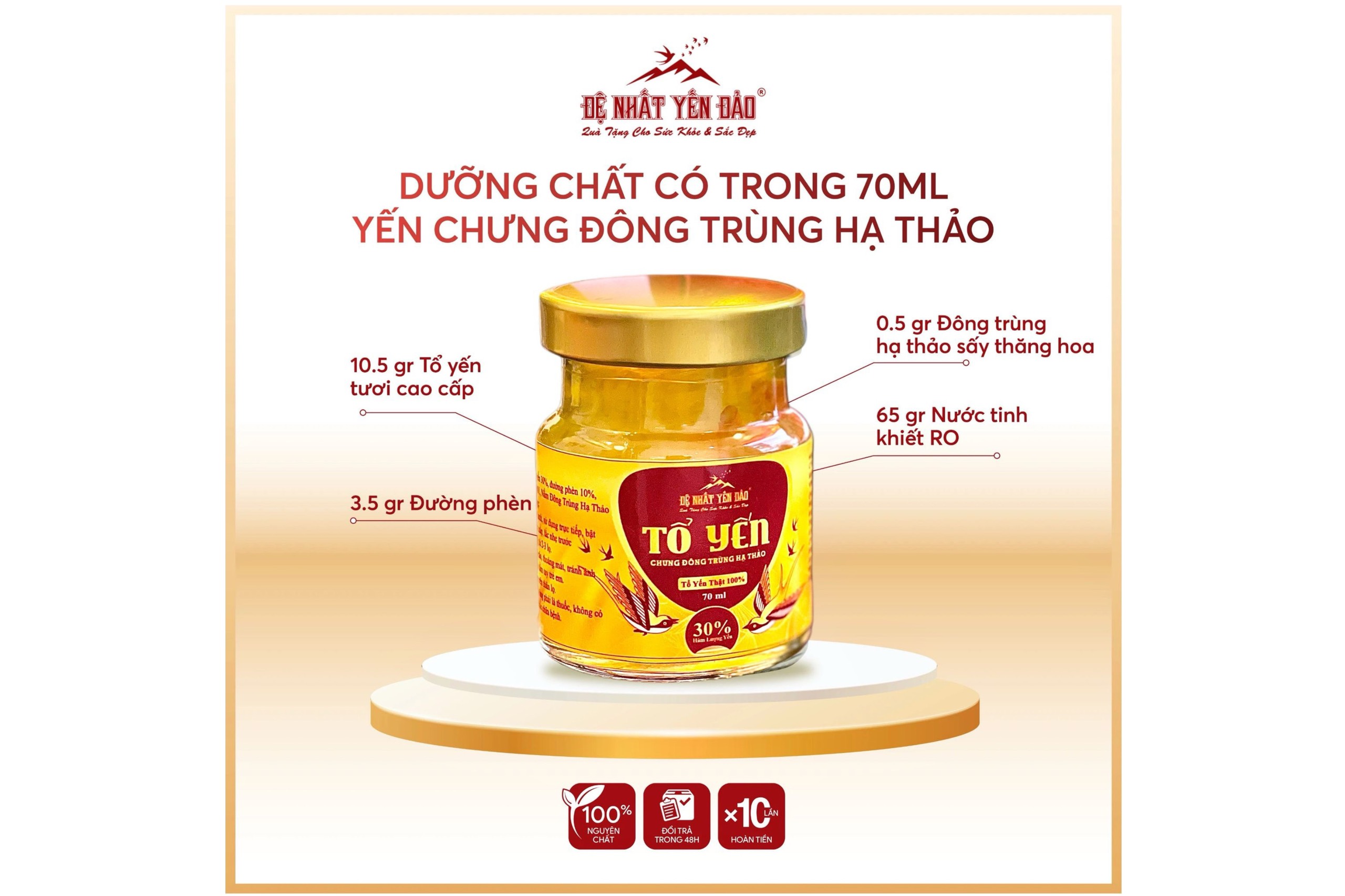 • Mỗi hũ là 70ml, dòng yến sử dụng là yến đảo vụn và kết hợp thêm sợi tảo biển giúp cho hũ yến giòn dai ngon hơn, có độ đặc sệt vừa phải và dễ dùng . Bổ sung dưỡng chất cho các thành viên trong gia đình sử dụng hàng ngày. Sản phẩm Tổ Yến Chưng Đông Trùng Hạ Thảo của Đệ Nhất Yến Đảo đặc biệt rất ít đường, dễ uống và không ngọt gắt. Tổ yến được chưng theo công nghệ mới ở nhiệt độ cao hơn so với phuong pháp chưng truyền thống cho nên sợi yến bung nở nhiều và hủ yến đậm đặc hơn, khác biệt hoàn toàn với các sản phẩm yến hủ khác hiện có trên thị trường. Quy trình chế biến sản xuất theo công nghệ khép kín, tất cả đều được thanh trùng ở nhiệt độ cao cho nên luôn đảm bảo chất lượng an toàn vệ sinh thực phẩm. Sản phẩm Tổ Yến Chưng Đông Trùng Hạ Thảo của Đệ Nhất Yến Đảo đã được kiểm định và công bố chất lượng, trên hủ yến và vỏ hộp có mã vạch để quý khách kiểm tra thông tin sản phẩm tránh mua phải hàng giả và kém chất lượng. Quý khách hoàn toàn có thể yên tâm khi sử dụng sản phẩm  ” Tổ Yến Chưng Đường Phèn của Đệ Nhất Yến Đảo chúng tôi ”.     Tổ Yến Chưng Đông Trùng Hạ Thảo của Đệ Nhất Yến Đảo là sự kết tinh hoàn hảo giữa đông trùng hạ thảo có hàm lượng dưỡng chất cao và yến sào Khánh Hòa. Hương vị thơm mát, tinh chất bổ dưỡng kết hợp với một chút đường phèn tạo nên mỹ vị nhân gian đắt giá.   THÔNG TIN VỀ TỔ YẾN CHƯNG ĐÔNG TRÙNG HẠ THẢO: Tổ Yến Chưng Đông Trùng Hạ Thảo là sản phẩm mang đến rất nhiều tác dụng cho sức khỏe con người, phù hợp cho nhiều đối tượng sử dụng.   Thành phần chính gồm có yến sào Khánh Hòa và đông trùng hạ thảo dạng sợi nấm tươi. Trong đó, yến sào 100% khai thác từ Khánh Hòa, sợi yến dai, ngon, giàu dưỡng chất quý hiếm.    Còn Đông trùng hạ thảo được nuôi cấy trong điều kiện môi trường chuẩn hóa, dưới sự giám sát của các chuyên gia đầu ngành. Đông trùng hạ thảo sở hữu hàm lượng dưỡng chất quý hiếm cao nhất thị trường nên khi kết hợp cùng yến sào càng mang lại nhiều tác dụng hơn cho sức khỏe người dùng.    Thương hiệu: Đệ Nhất Yến Đảo Nguồn gốc xuất xứ: Việt Nam Thành phần: Yến sào Khánh Hòa, nấm đông trùng hạ thảo, nước tinh khiết, đường phèn. Quy cách đóng gói: Lọ thủy tinh 70ml, hộp 6 lọ.   THÀNH PHẦN CHÍNH: Tổ Yến Chưng Đông Trùng Hạ Thảo là sản phẩm hòa quyện giữa hai nguyên liệu quý hiếm yến sào đã chưng nấu sẵn kết hợp cùng đông trùng hạ thảo, đường phèn và nước tinh khiết.   Sự kết hợp theo tỉ lệ vàng, công thức nghiên cứu hoàn chỉnh, tận dụng triệt để các tinh chất quý hiếm tạo nên một sản phẩm chất lượng, chăm sóc sức khỏe an toàn, lành tính và bổ dưỡng.         CÔNG DỤNG CỦA TỔ YẾN CHƯNG ĐÔNG TRÙNG HẠ THẢO: