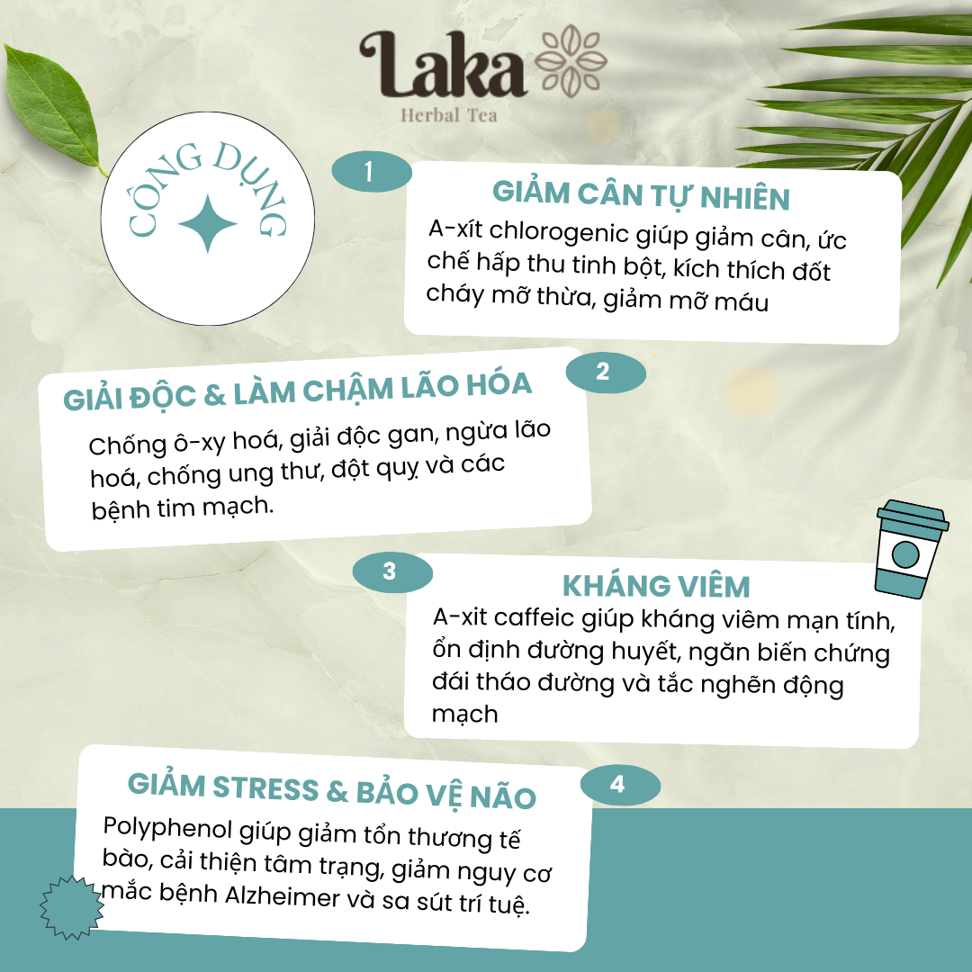 Thông tin chung : THƯƠNG HIỆU: LAKA TEA TÊN SẢN PHẨM: Trà Cà Phê Cascara LAKA XUẤT XỨ: Việt Nam SỐ LƯỢNG và QUY CÁCH: Hộp 60gram DÀNH CHO: Người lớn từ 18 tuổi trở