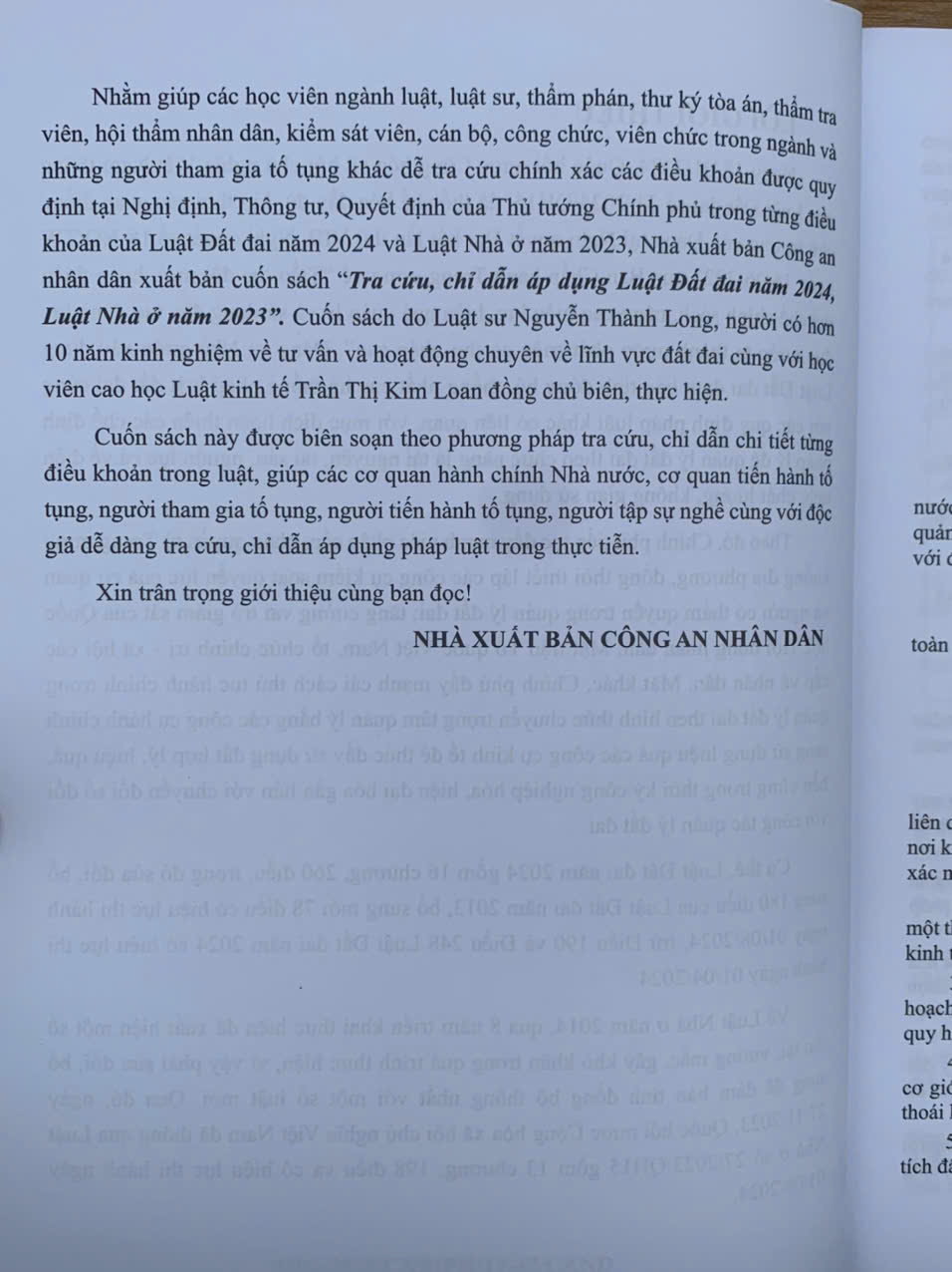 Nhằm giúp các học viên ngành luật, luật sư, thẩm phán, thư ký tòa án, thẩm tra viên, hội thẩm nhân dân, kiểm sát viên, cán bộ, công chức, viên chức trong ngành và những người tham gia tố tụng khác dễ tra cứu chính xác các điều khoản được quy định tại Nghị định, Thông tư, Quyết định của Thủ tướng Chính phủ trong từng điều khoản của Luật Đất đai năm 2024 và Luật Nhà ở năm 2023, Nhà xuất bản Công an nhân dân xuất bản cuốn sách “Tra cứu, chỉ dẫn áp dụng Luật Đất đai năm 2024, Luật Nhà ở năm 2023”. Cuốn sách do Luật sư Nguyễn Thành Long, người có hơn 10 năm kinh nghiệm về tư vấn và hoạt động chuyên về lĩnh vực đất đai cùng với học viên cao học Luật kinh tế Trần Thị Kim Loan đồng chủ biên, thực hiện.