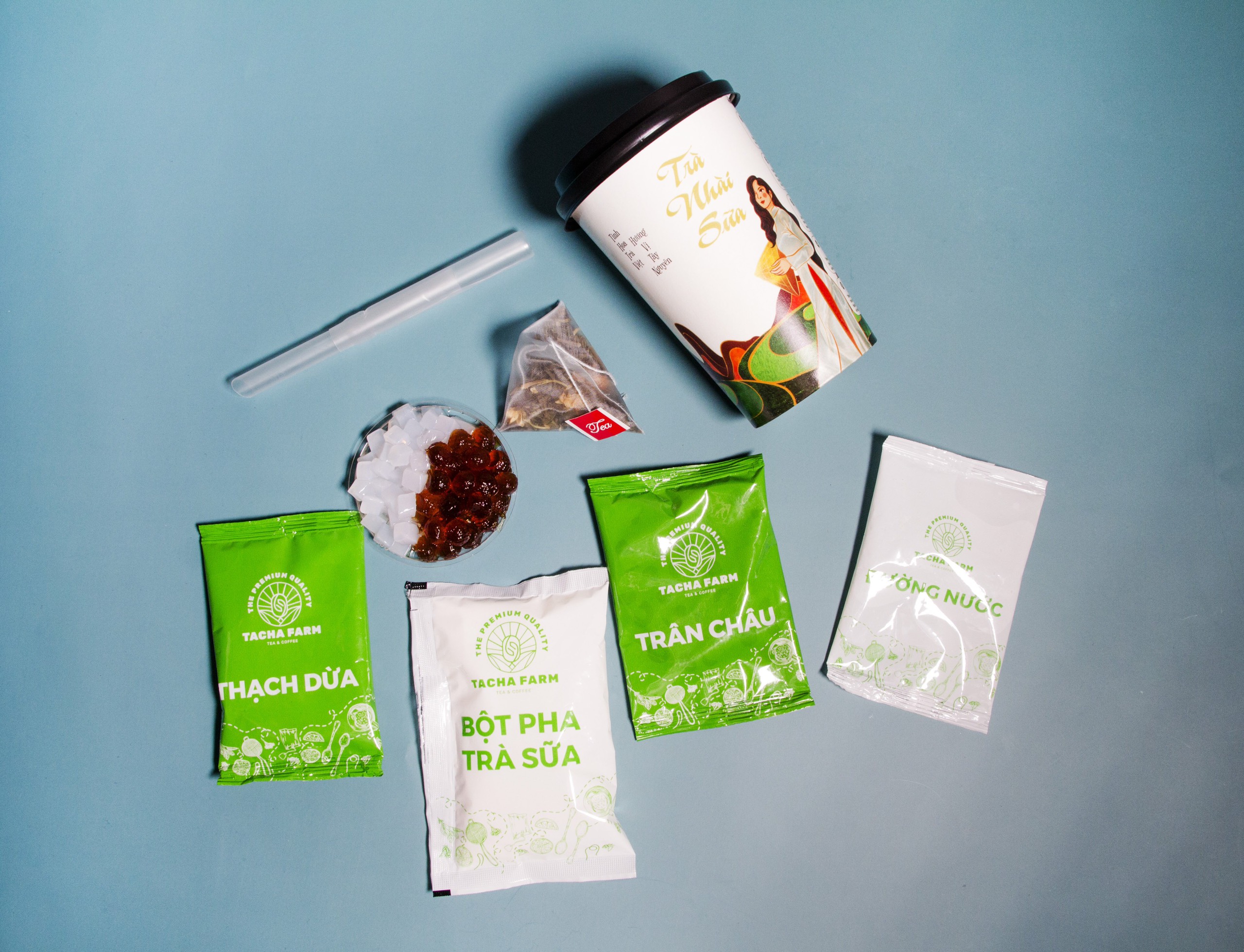 Trong 1 ly trà sữa tự pha TACHA FARM vị Hồng Trà sữa nướng gồm: - 1 Túi trà túi lọc vị hồng trà nướng - 1 túi bột pha trà sữa - 1 túi