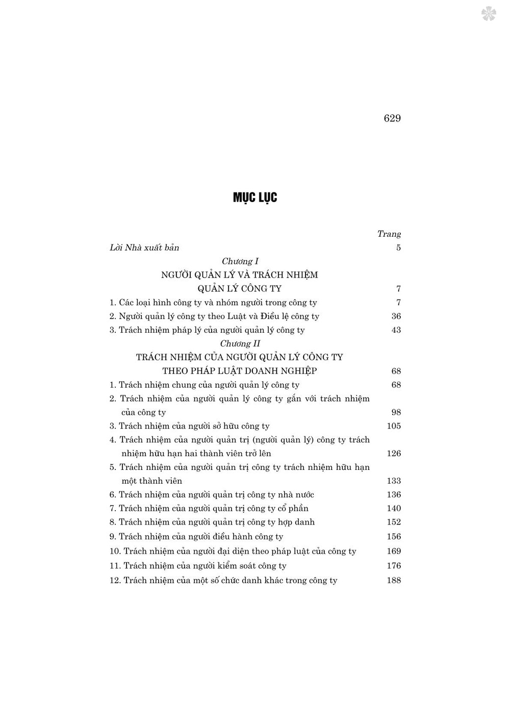 Mua tại TiktokNgười quản lý công ty đóng vai trò đặc biệt quan trọng quyết định sự vận động và phát triển của mỗi công ty, đồng thời phải thực hiện những trách nhiệm theo quy định của pháp luật. Cuốn sách Trách nhiệm của người quản lý công ty (Các nghĩa vụ và yêu cầu pháp lý) của Luật sư, Trọng tài viên VIAC Trương Thanh Đức và Luật sư Trương Trung Nghĩa, bao gồm 07 chương, 38 mục và 356 tiểu mục, giúp độc giả thấy rõ từ tổng thể đến chi tiết các vấn đề về trách nhiệm pháp lý của người quản lý công ty theo pháp luật Việt Nam trong từng loại hình công ty, với từng lĩnh vực cụ thể, như đầu tư kinh doanh, tài chính, ngân hàng, lao động, công nghệ và các lĩnh vực khác.
