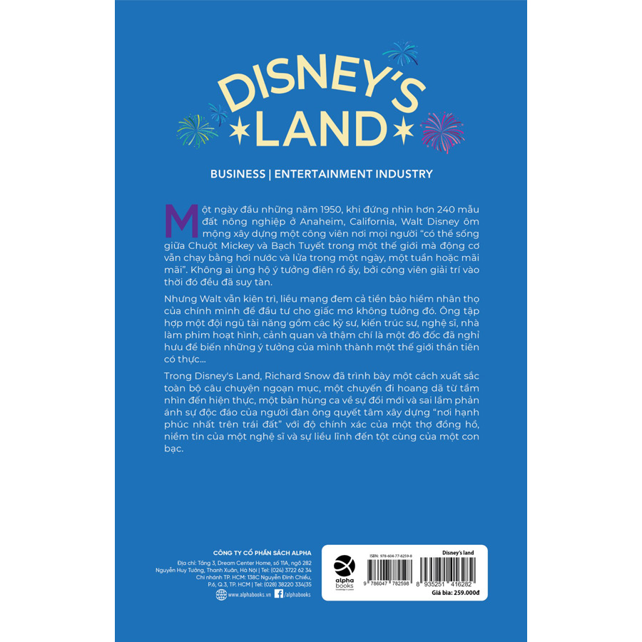 Với cuốn sách này, chuyên gia viết chuyện sử Richard Snow đưa người đọc đi qua quá trình nung nấu ý tưởng của Disney cho Disneyland, một công viên giải trí sáng tạo hơn bất kỳ công viên giải trí nào vào thời điểm đó. Với cuốn sách Disney's Land, Richard Snow trình bày một cách xuất sắc toàn bộ câu chuyện ngoạn mục, một chuyến đi hoang dã từ tầm nhìn đến hiện thực, một bản hùng ca về sự đổi mới và sai lầm phản ánh sự độc đáo của người đàn ông quyết tâm xây dựng “nơi hạnh phúc nhất trên trái đất” với độ chính xác của một thợ đồng hồ, niềm tin của một nghệ sĩ và sự liều lĩnh đến tột cùng của một con bạc.