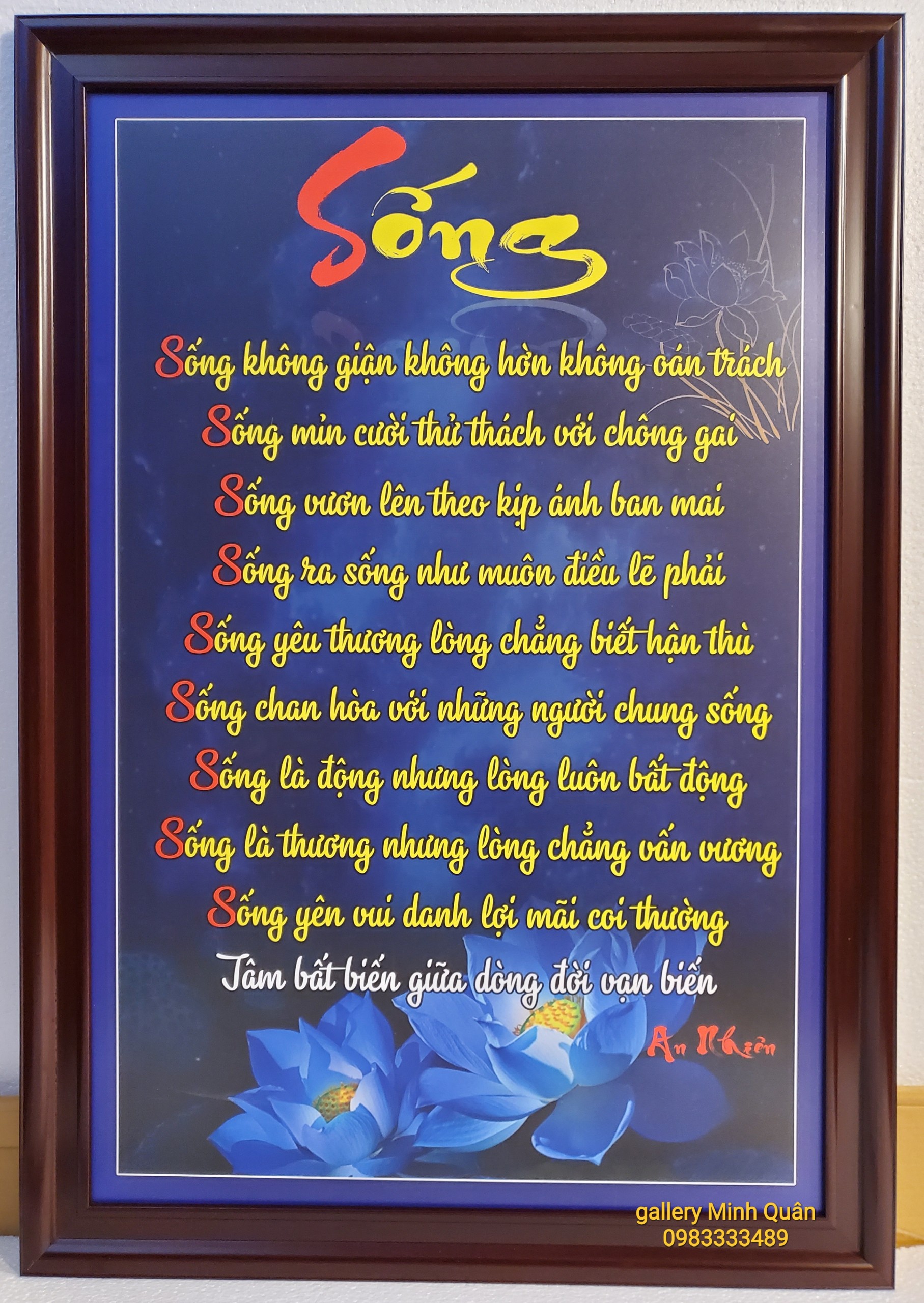 Tranh in dầu nghệ thuật chữ SỐNG -ID196 Chất liệu tranh in dầu trên lụa cao cấp được phủ lớp màng pe bảo vệ bề mặt tranh, dán ép trên tấm pormex dày 5mm độ bền màu đảm bảo trên 10 năm vẫn như mới. Tấm formex có trọng lượng nhẹ,không cong vênh chịu mọi thời tiết nóng , lạnh nồm ẩm, không thấm nước, dễ lau chùi bằng khăn ướt, không độc hại. Khung tranh nhựa composit màu vân gỗ hoặc hoa văn vàng bền đẹp mãi với thời gian.                        - Sống - Sống không dận không hờn không oán trách. Sống mìm cười thử thách với trông gai Sống vươn lên theo kịp ánh ban mai Sống ra sống như muôn điều lẽ phải Sống yêu thương lòng chẳng biết hận thù Sống chan hòa với những người chung sống Sống là động nhưng lòng luôn bất động Sống là thương nhưng lòng chẳng vấn vương Sống yên vui danh lợi mãi coi thường Tâm bất biến giữa dòng đời vạn biến                                                Tâm An