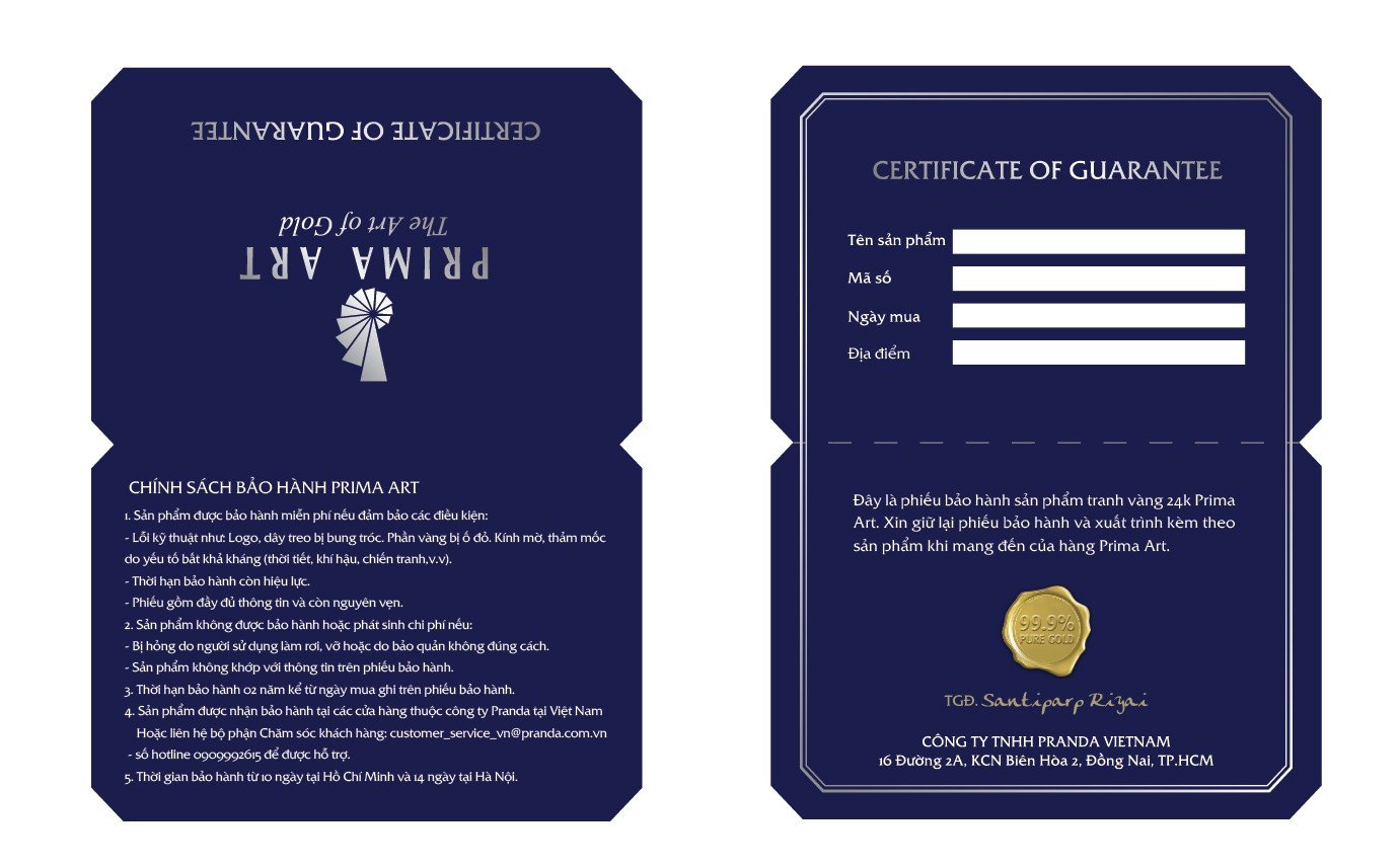 Đây là sản phẩm sáng tạo chất lượng cao của thương hiệu PRIMA ART, được thiết kế và chế tạo quy trình nghiêm ngặt của Cty TNHH Pranda Việt Nam, thành viên của Tập đoàn Pranda, Thái Lan. Mỗi sản phẩm PRIMA tác phẩm nghệ thuật thủ công sử dụng vàng 24K, chế tác bởi các thợ kim hoàn có tay nghề cao với kỹ thuật hiện đại.