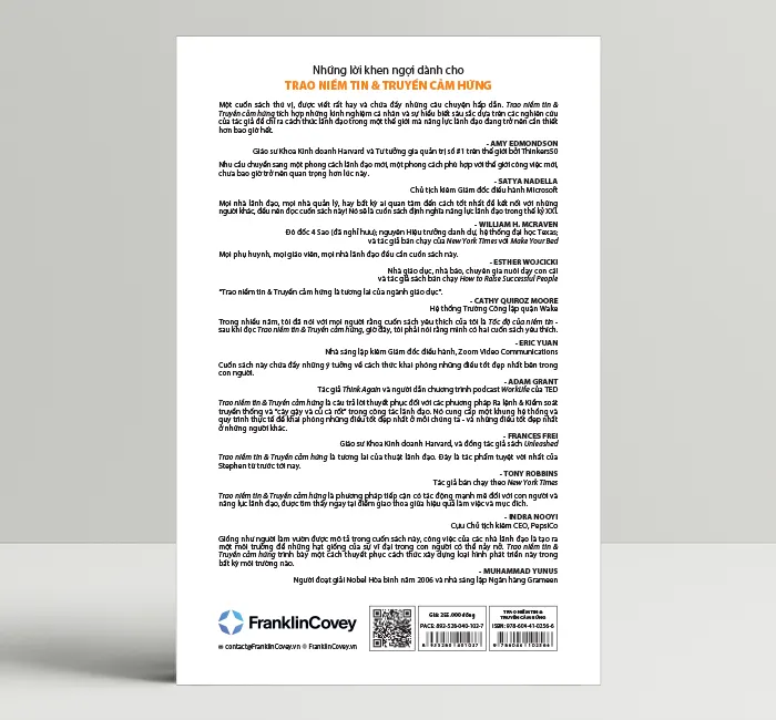 “Một cuốn sách thú vị, được viết rất hay và chứa đầy những câu chuyện hấp dẫn. “Trao niềm tin & Truyền cảm hứng” tích hợp những kinh nghiệm cá nhân và sự hiểu biết sâu sắc dựa trên các nghiên cứu của tác giả để chỉ ra cách thức lãnh đạo trong một thế giới mà năng lực lãnh đạo đang trở nên cần thiết hơn bao giờ hết.” - Amy Edmondson, giáo sư Khoa Kinh doanh Harvard và Tư tưởng gia quản trị số #1 trên thế giới bởi Thinkers50