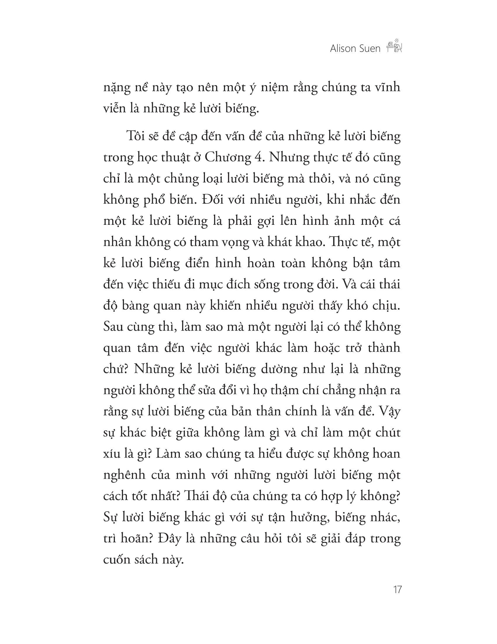 Trái ngược lại với văn hóa phát huy hết hiệu suất làm việc của chúng ta, Alison Suen cảm thấy thật nực cười khi chúng ta luôn chỉ trích kẻ lười biếng – những cá nhân chỉ làm cho qua chuyện để được yên thân. Bà đưa ra phân loại những kiểu chỉ trích người lười biếng thường thấy, và biện luận rằng những đánh giá trên sai, hoặc là tiền đề của những đánh giá đó có vấn đề. Tuy cuốn sách này bào chữa cho sự lười biếng, nhưng nó không hề bênh vực lối sống lười biếng và nâng tầm nó lên thành chìa khóa hướng đến điều gì đó tốt đẹp hơn (như bước tiến mới của văn hóa hay sự tự giác ngộ bản thân gì đó), như một vài học giả vẫn nói.