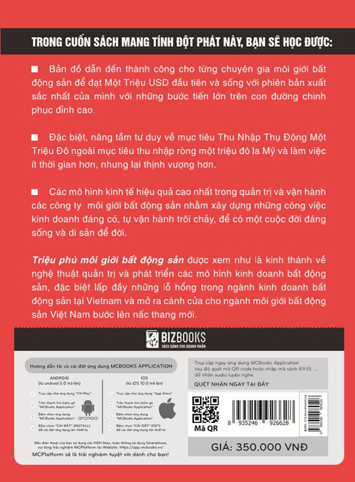 - Các mô hình kinh tế hiệu quả cao nhất trong quản trị và vận hành các công ty môi giới bất động sản nhằm xây dựng những công việc kinh doanh đáng có, tự vận hành trôi chảy, để có một cuộc đời đáng sống và di sản để đời. Theo như lời tựa trong cuốn sách, những người làm bất động sản chuyên nghiệp trên khắp thế giới và từ mọi tổ chức khác nhau đều áp dụng những mô hình và kiến thức trong sách. Cho tới nay, với hơn 600.000 cuốn đã bán mà rất nhiều độc giả yêu mến gọi bằng cái tên “Sách Đỏ”, các chuyên gia bất động sản ở khắp nơi trên thế giới đã cùng nói chung một ngôn ngữ: tìm nguồn khách mua bất động sản (leads), tìm bất động sản cần chào bán (listings) và đòn bẩy (leverage). Quan trọng hơn, họ trao đi các phương pháp họ thường sử dụng để điều hành công việc kinh doanh, tất cả đều được chia sẻ trong các mô hình và kiến thức. Vậy nên, dù cho các chữ cái và ký tự có thể thay đổi ở mỗi quốc gia, và các quy trình giao dịch bất động sản có thể rất khác nhau, nhưng các khái niệm cốt lõi của cuốn sách và nhân tố quan trọng đưa tới thành công cho công việc kinh doanh bất động sản thì không hề khác biệt. Đánh giá về cuốn sách bán chạy nhất nước Mỹ “Cuốn sách này như được viết đặc biệt dành cho những người môi giới bất động sản riêng lẻ cũng như những người lãnh đạo, sáng lập và quản trị các sàn giao dịch bất động sản tại Việt Nam. Cuốn sách này là kho báu giúp mỗi cá nhân tìm ra đường hướng phát triển sự nghiệp bền vững của mình. Và không chỉ đọc 1 lần mà phải nhiều lần, nhiều năm song hành với nhiều trải nghiệm và lớn lên cùng với sự phát triển tư duy và năng lực cũng như kết quả thực tế đạt được” – Hong Nhung Nguyen – Chủ tịch Keller Williams Việt Nam “ĐÓ KHÔNG phải là một giấc mơ hão huyền! Khái niệm và mô hình của Triệu phú môi giới bất động sản đơn giản, dễ hiểu và rất khả thi. Gary Keller đã xây dựng kế hoạch chi tiết cho việc đạt được thành công. Nếu bạn có thể ra khỏi giường vào buổi sáng và tuân thủ kỷ luật, thì không gì có thể ngăn cản bạn thành công” – Peggy Devoney Atlanta, CA “Triệu phú môi giới bất động sản đã làm thay đổi cuộc sống của tôi! Những khái niệm trong sách đã thức tỉnh và khai sáng cho tôi. Những hệ thống vạch sẵn để tôi theo đuổi trong cuốn sách này thật sự vô giá. Bạn chỉ cần cầm sách, luôn mang theo bên mình, giống như một tấm bản đồ chỉ đường đưa bạn đến đích” – Leith Seegers–McKahan Arlington, TX “Triệu phú môi giới bất động sản là một mục tiêu sừng sững cho bất kỳ ai muốn phấn đấu. Cuốn sách đưa ra những mô hình cho thấy đường đi và cả cạm bẫy. Ngay từ những trang đầu tiên, Gary đã nói rõ rằng “tiền” không phải là vấn đề bàn đến ở đây, mà chỉ là một yếu tố soi sáng vấn đề. Mục đích cuối cùng là xây dựng một công việc kinh doanh đáng kể để có được một cuộc đời đáng sống” – Kathy Auerbach Bellingham, WA “Tài liệu này đưa ra những kỹ năng rất dễ hiểu, có thể giúp bất kỳ chuyên gia bất động sản nào đạt được đến Cấp độ 7 và có công việc kinh doanh tự vận hành trôi chảy” – Tim Burroughs Boise, ID “Giá trị của cuốn sách không chỉ là ‘mở mắt’ cho độc giả. Nó ‘mở ra cánh cửa’ cho tôi bước lên nấc thang mới. Gary biết cách giao tiếp trực tiếp với bạn như thể ông ấy chỉ nói chuyện với mỗi bạn thôi” – Paul Andres San Francisco, CA Về tác giả Bobby Bones là người dẫn chương trình của The Bobby Bones Show, một chương trình phát thanh nhạc đồng quê buổi sáng được phát trên toàn quốc qua mạng luwosi Premiere Networks. Trên toàn quốc, The Bobby Bones Show là chương trình ca nhạc đồng quê buổi sáng lớn nhất thế giới, với lượng khán giả ước tính khoảng gần 8 triệu người nghe. Anh là người trẻ nhất từ trước tới nay được ghi danh trong National Radio Hall of Fame và là tác giả của cuốn sách bán chạy nhất Bare Bones theo bình chọn của New York Times, Wall Street Journal, USD Today. Anh cũng có những ca khúc dẫn đầu trên bảng xếp hạng Billboard. Anh thậm chí còn từng tham gia đóng phim.