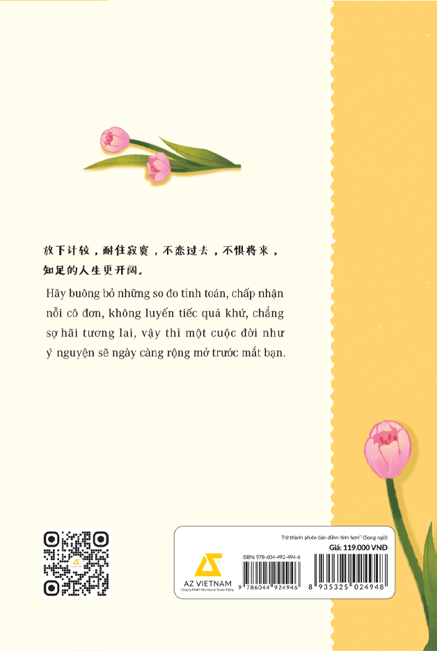 Hãy để “Trở thành phiên bản điềm tĩnh hơn” • Bản song ngữ Trung – Việt được đồng hành cùng bạn trong hành trình tìm kiếm bình yên và hoàn thiện chính mình. Nhẹ nhàng và tinh tế, cuốn sách sẽ luôn nhắc nhở bạn rằng: Dù cuộc sống có vội vã đến đâu, chỉ cần tâm tĩnh – lòng an, thì mọi điều tốt đẹp tự khắc sẽ tìm đến.