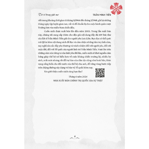 Cuốn sách được xuất bản lần đầu năm 2005. Trong lần xuất bản này, chúng tôi cung cấp thêm cho độc giả nội dung đầy đủ 109 bức thư của liệt sĩ Trần Minh Tiến gửi cho người yêu Lưu Liên. Bạn đọc có thể quét mã QR in kèm nội dung sách để đọc và cảm nhận những tâm tư, tình cảm, suy nghĩ sâu sắc đầy yêu thương và trách nhiệm đối với người yêu, đối với cuộc đời, đối với Tổ quốc của người lính trẻ Trần Minh Tiến.