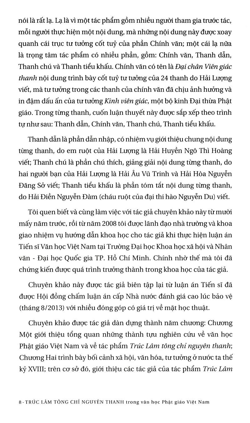 Cuối năm ngoái (năm 2017), tác giả đã cho xuất bản tập tiểu luận Nghiên cứu về Trúc Lâm tông chỉ nguyên thanh do Nhà xuất bản Khoa học xã hội ấn hành, gồm 15 bài nghiên cứu về tác phẩm luận thuyết này đã công bố trên các tạp chí. Năm nay tác giả biên tập lại luận án đã bảo vệ thành công từ 5 năm trước để cho xuất bản. Có thể thấy đây là một chuyên khảo đầu tiên trong học giới nước nhà nghiên cứu đầy đủ, chuyên sâu và toàn diện về luận thuyết triết học Phật giáo Thiền tông Trúc Lâm tông chỉ nguyên thanh của Ngô Thì Nhậm và các đạo hữu.