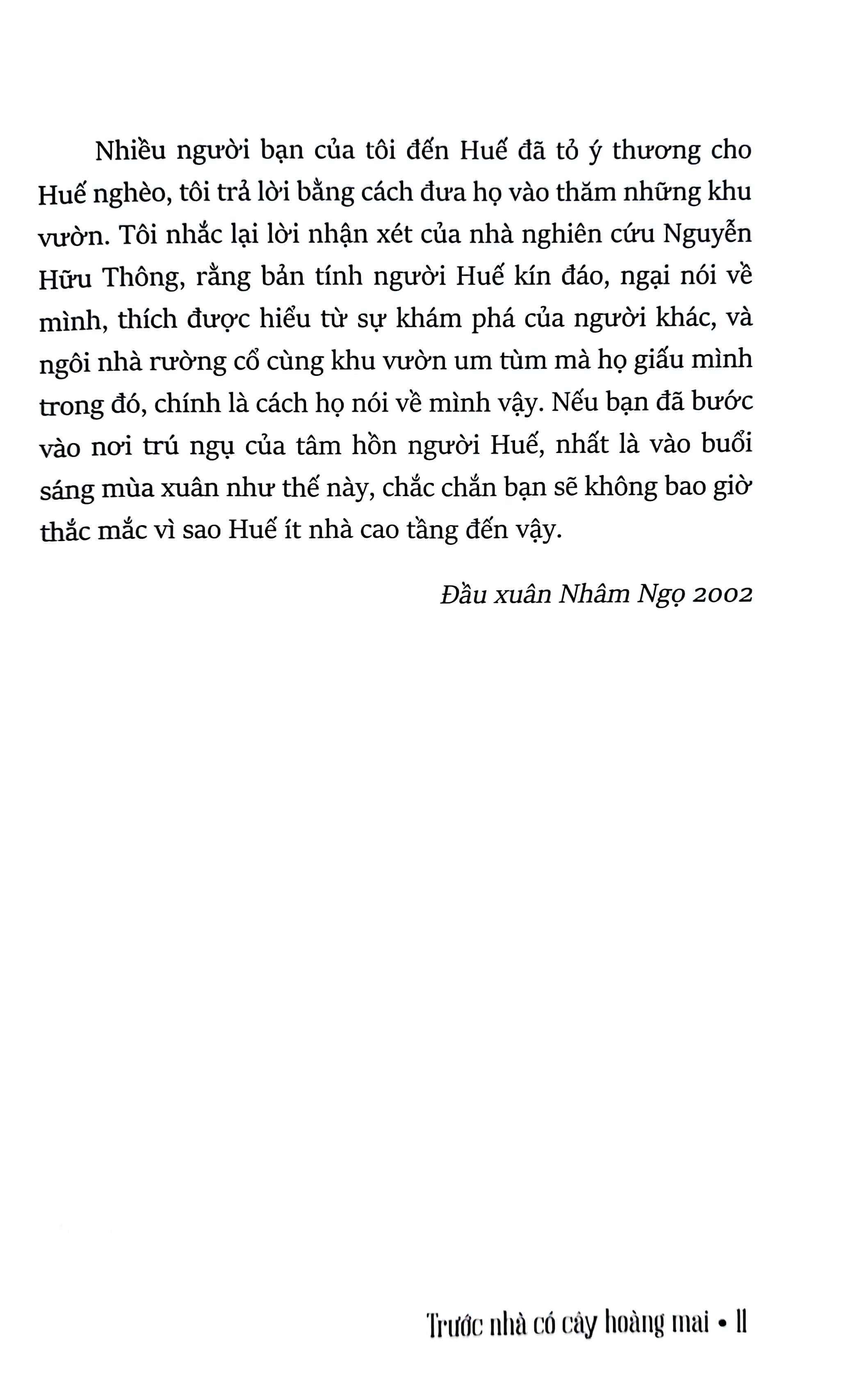 Nhà văn Vĩnh Quyền nói: “Trước nhà có cây hoàng mai của Minh Tự mang dấu ấn một thời sống bên ngoài Huế và cách nhìn - nghĩ của nghề báo, làm nên sự khác biệt với những tác giả viết về Huế – khúc ruột của m.ình – bằng tinh thần cực đoan đáng yêu kiểu ‘không nơi nào có được’ hoặc ‘chẳng thể nào đổi khác’.”