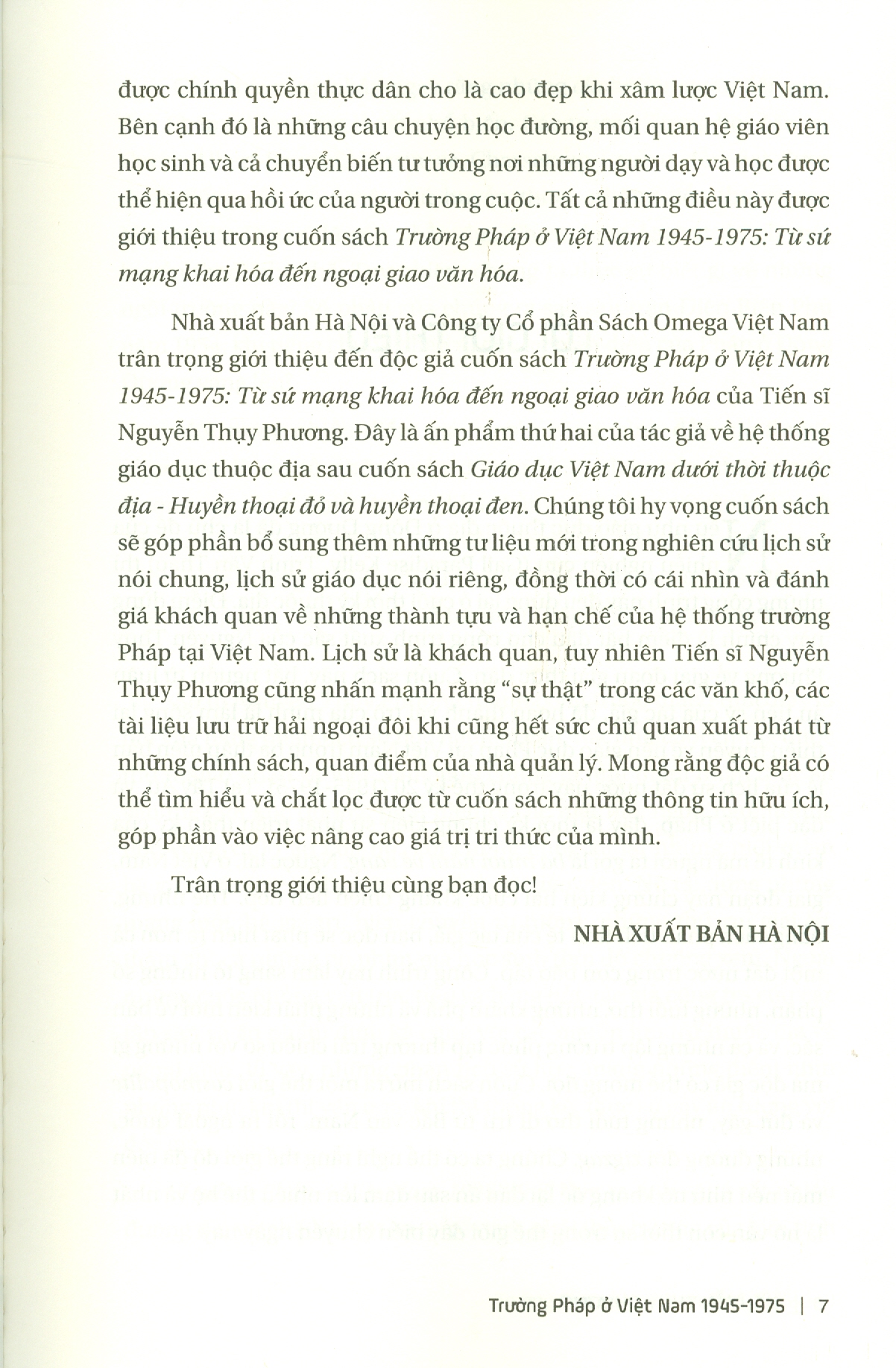 Cuốn sách này, bắt nguồn từ luận án tiến sỹ của tác giả, đã hoàn thành vai trò của mình là làm sống lại thiên truyện về nền giáo dục Pháp tại Việt Nam trong ba thập niên bản lề của lịch sử đất nước này trong thế kỷ 20 (1945-1975).
